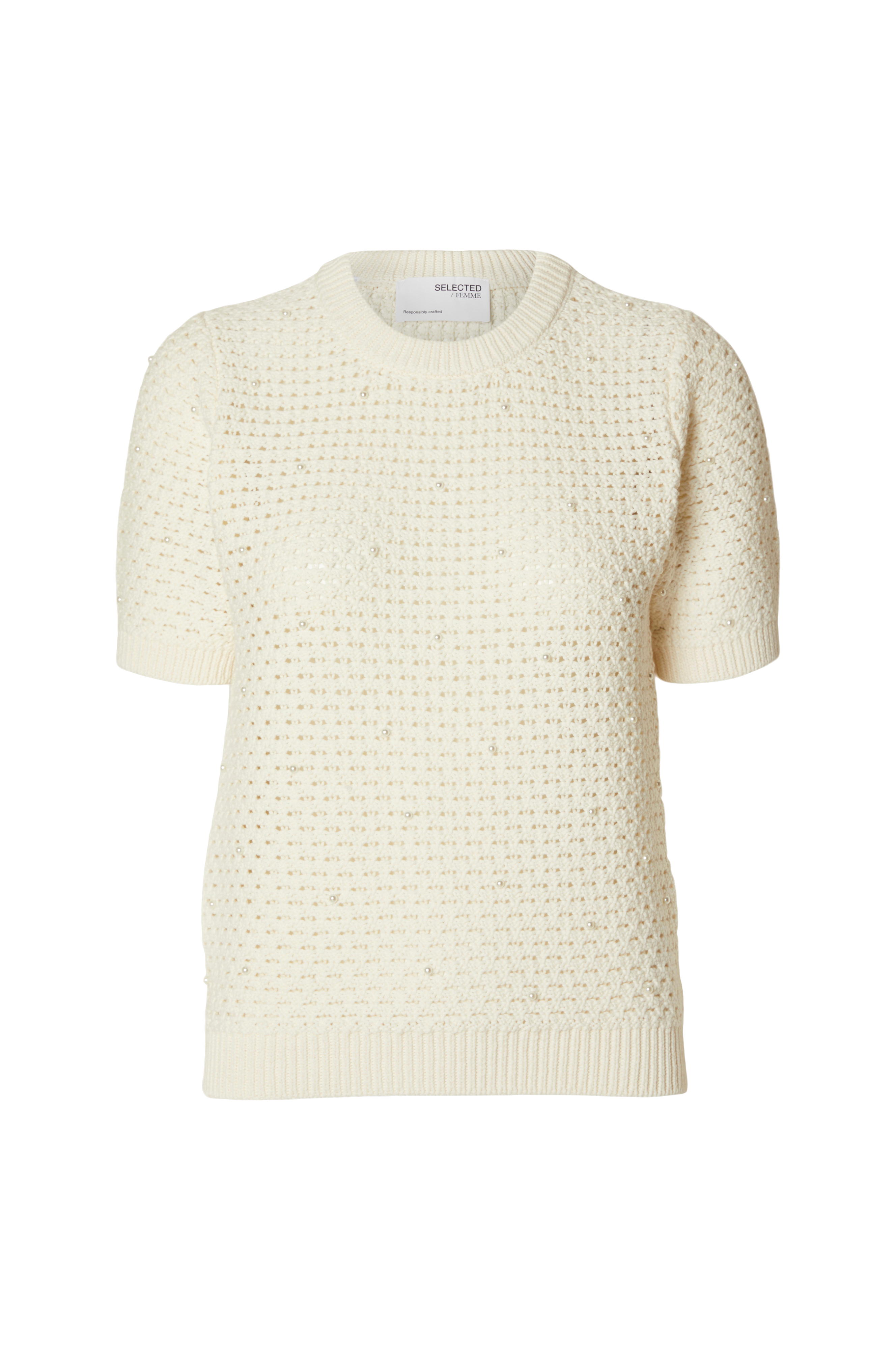 • Strukturstrikket trøje med hulmønster• Dekorative perler foran• Korte ærmer
