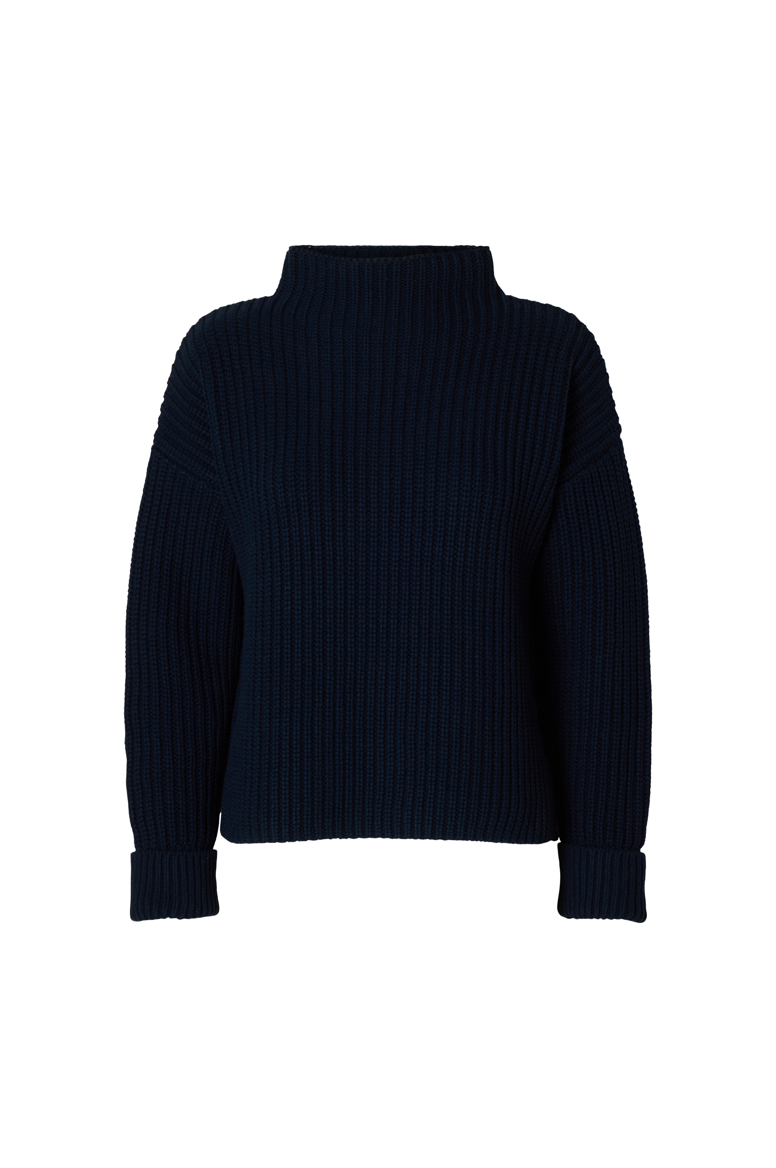 Trøje slfSelma LS Knit T-neck fra Selected Femme, løs model med lav skuldersøm, oprullede ærmer og standkrave. Trøjen er noget længere bagpå og har slids i siderne.