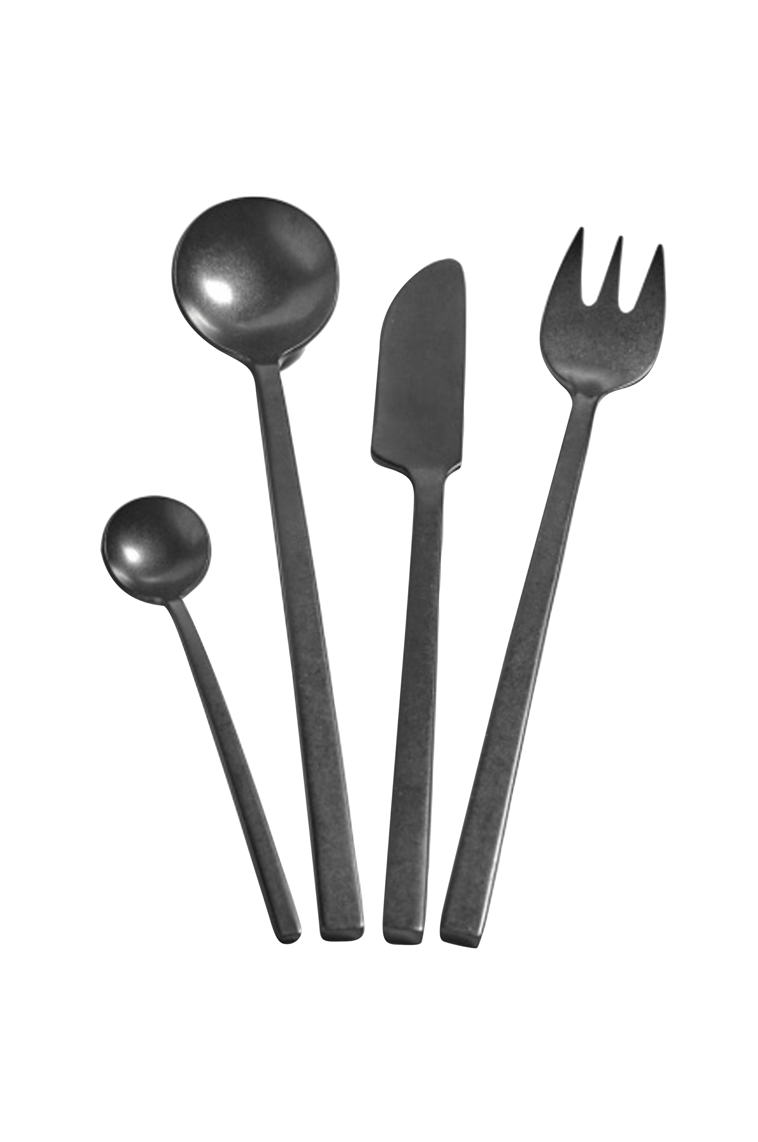Gaflen, skeen, suppeskeen, kniven og kaffeskeen i rustfrit stål blev omhyggeligt skabt med en streng profil for at opveje bordets muntre natur. Resultatet er fire unikke former, der afviger fra typisk bestik, da suppeskeen, gaflen og kniven flugter fejlfrit og giver et behageligt, organisk udtryk. Denne serie fås i rustfrit stål stone wash og sort PVD stone wash.