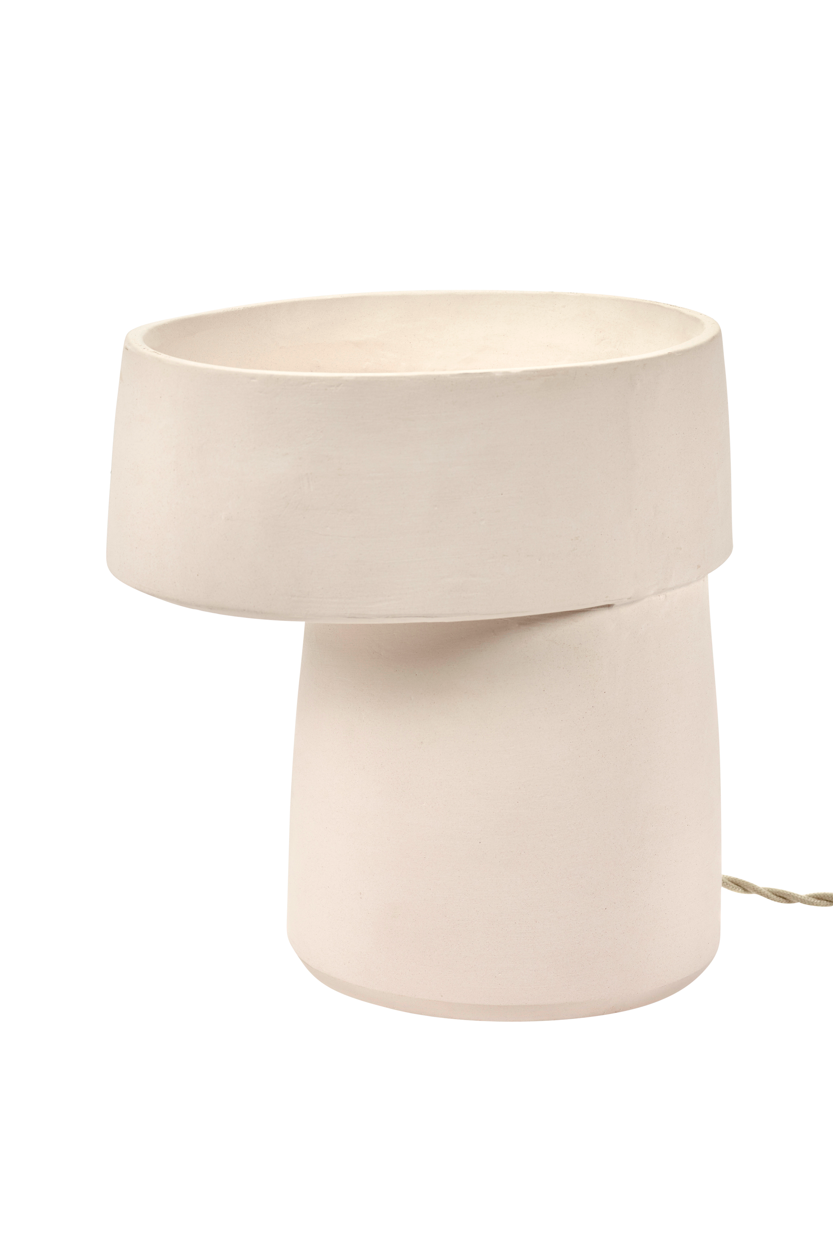 Med romé har keramikeren alex gabriels designet en lampe i keramik. romé er skabt på hendes drejeskive og består af to cylindre, der begge er koniske, og som efterfølgende er blevet sat sammen. Resultatet er et rent, elegant design med et par grove detaljer, som fremhæver lampens håndlavede karakter.