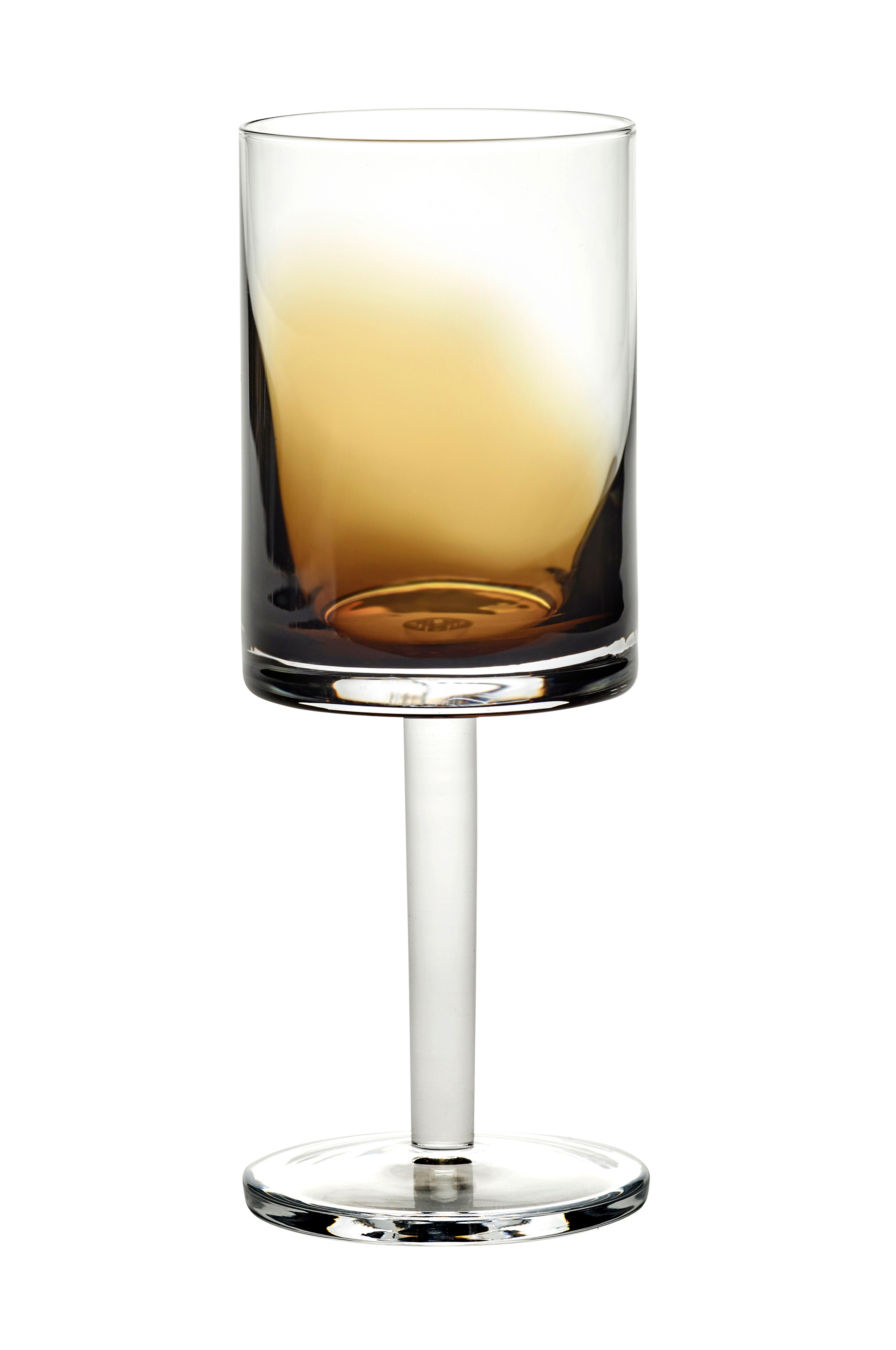 Kelly Wearstlers kollektion udvides med fire unikke glasdesigns: et champagneglas, en champagnecoupe, et hvidvinsglas og et rødvinsglas. Deres ravfarvede undertoner fremkalder en følelse af glasvarer fra den gamle verden, skabt gennem en glasfremstillingsproces med tre lag. Et bemærkelsesværdigt farveforløb kombineret med en tyk bund og en strømlinet silhuet giver en slående visuel appel.