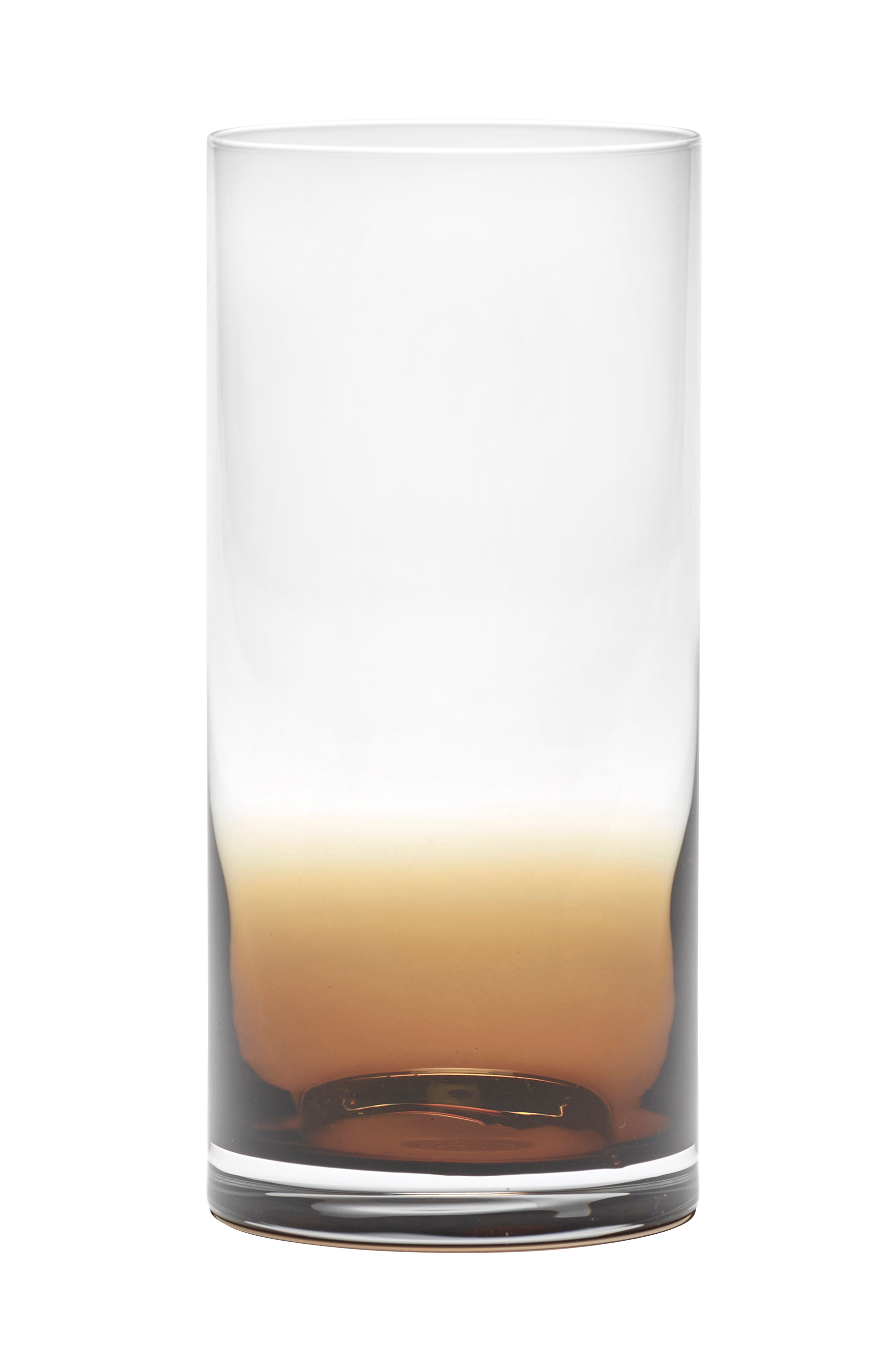Sammen med sit porcelænsservice har Kelly Wearstler designet en række ravfarvede glasstykker, der minder om antikke og vintage samlinger verden over. Denne lagdelte farveprogressionsmetode opnås med tre lag glas, hvor en varmtonet kerne er indlejret mellem to klare lag. Den luftige nuance skaber en slående kontrast til den kraftige glasbund og den strømlinede, lodrette form på disse tumblerglas.