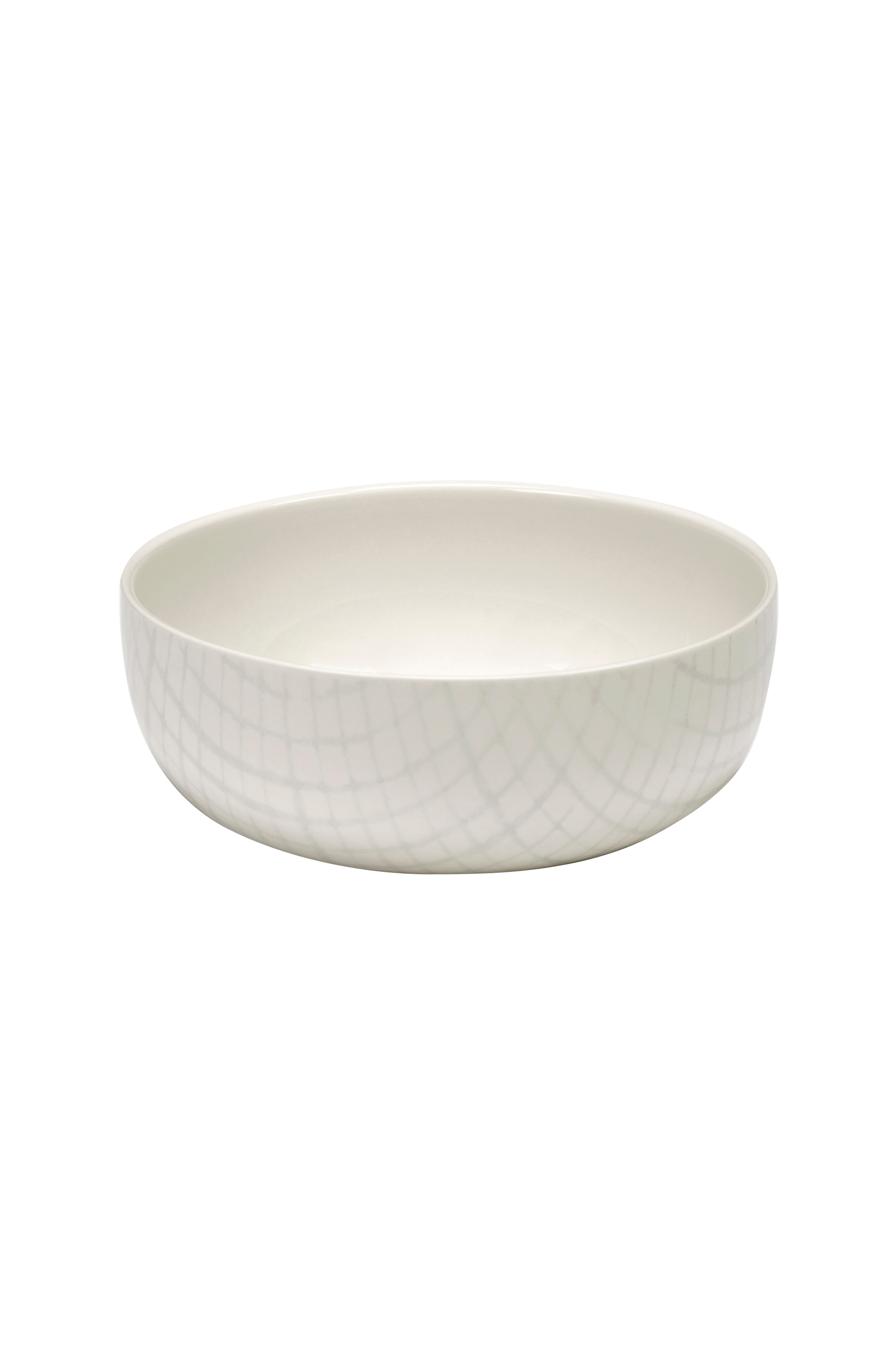 Kelly Wearstler startede med digitale grafiske elementer og Bauhaus-koncepter for at forme Zuma, hendes porcelænsserie. Hvert mønster er omhyggeligt stemplet på hvert stykke for at opnå et malet indtryk og derefter forseglet med en glasur, der giver en glat finish. Designet varierer, hvilket gør det nemt at kombinere forskellige former og nuancer - hvid, mørkegrå og en iøjnefaldende blød orange accent.