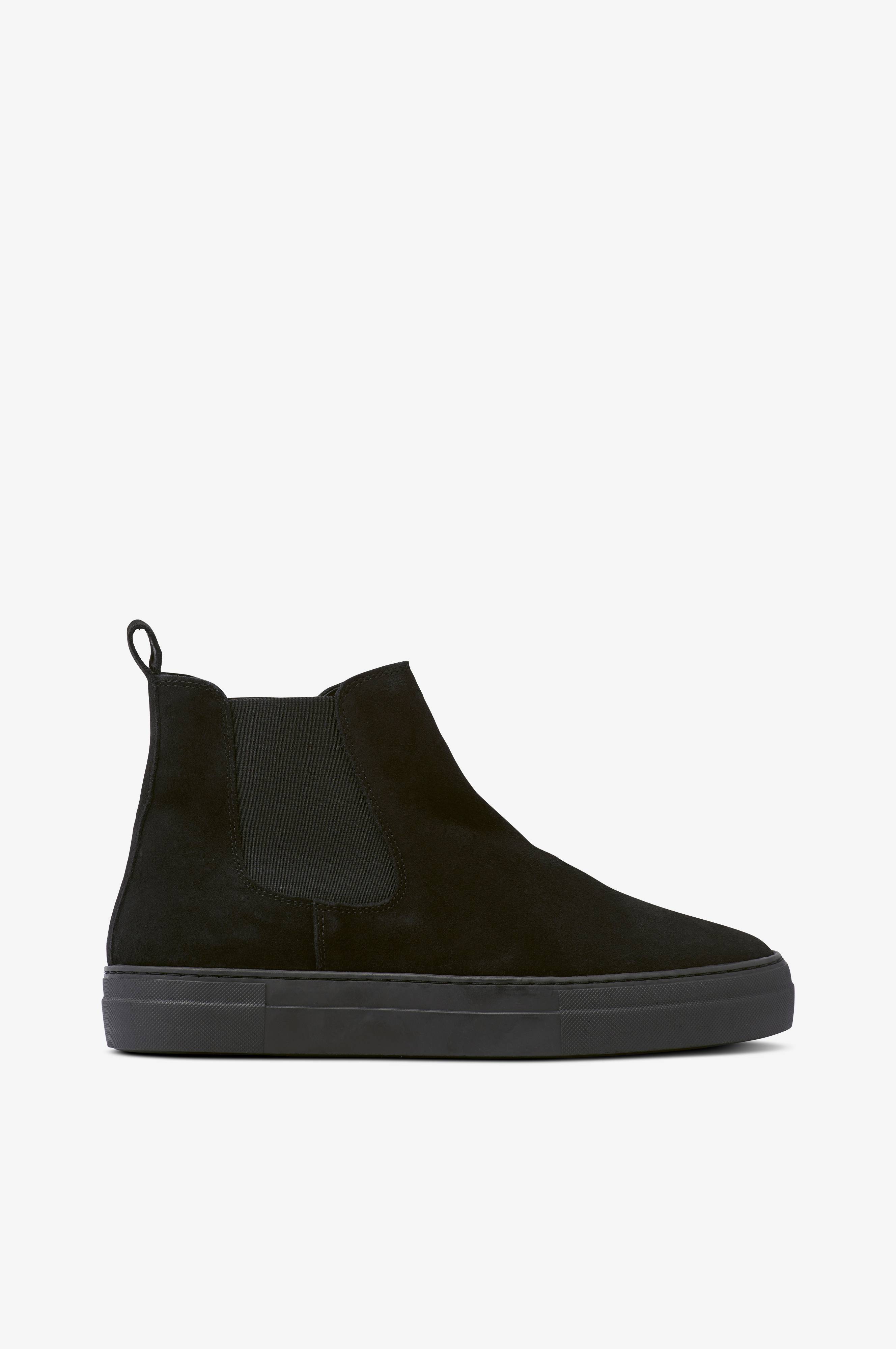 Chelseaboots Karl fra Shepherd i ruskind med elastikindsatse på begge sider af skaftet og strop bagpå. Varmt for i fåreuld. Ydersål i gummi.
