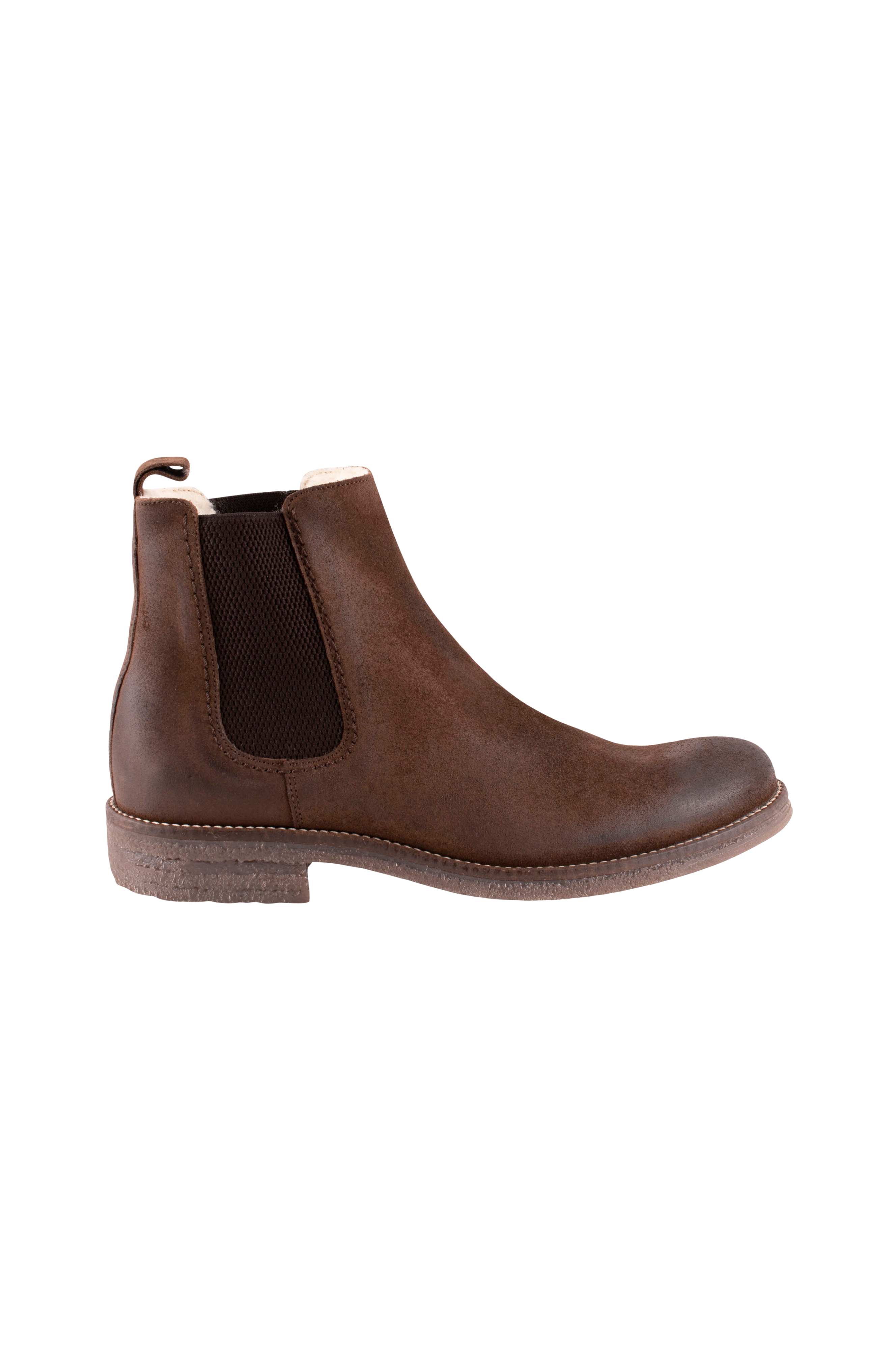 Shepherd emanuel er et par chelsea boots i ruskind med varmt og behageligt fåreskind på indersiden. Støvlerne har bred elastik på siderne af skaftet og et mærke bagpå. Ydersålen er lavet af gummi og har dekorative syninger.