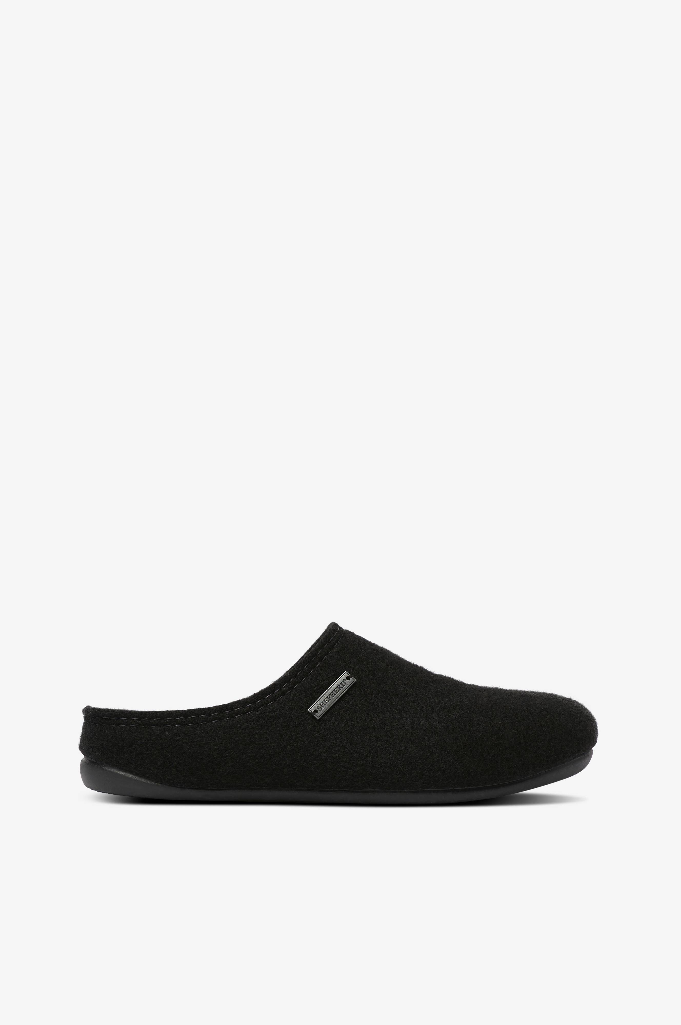 Hjemmesko i klassisk slip on-model af filtet fåreuld med behagelig, skålformet hæl. Polstret, blød indersål beklæd med ruskind. Fjedrende ydersål i gummi.