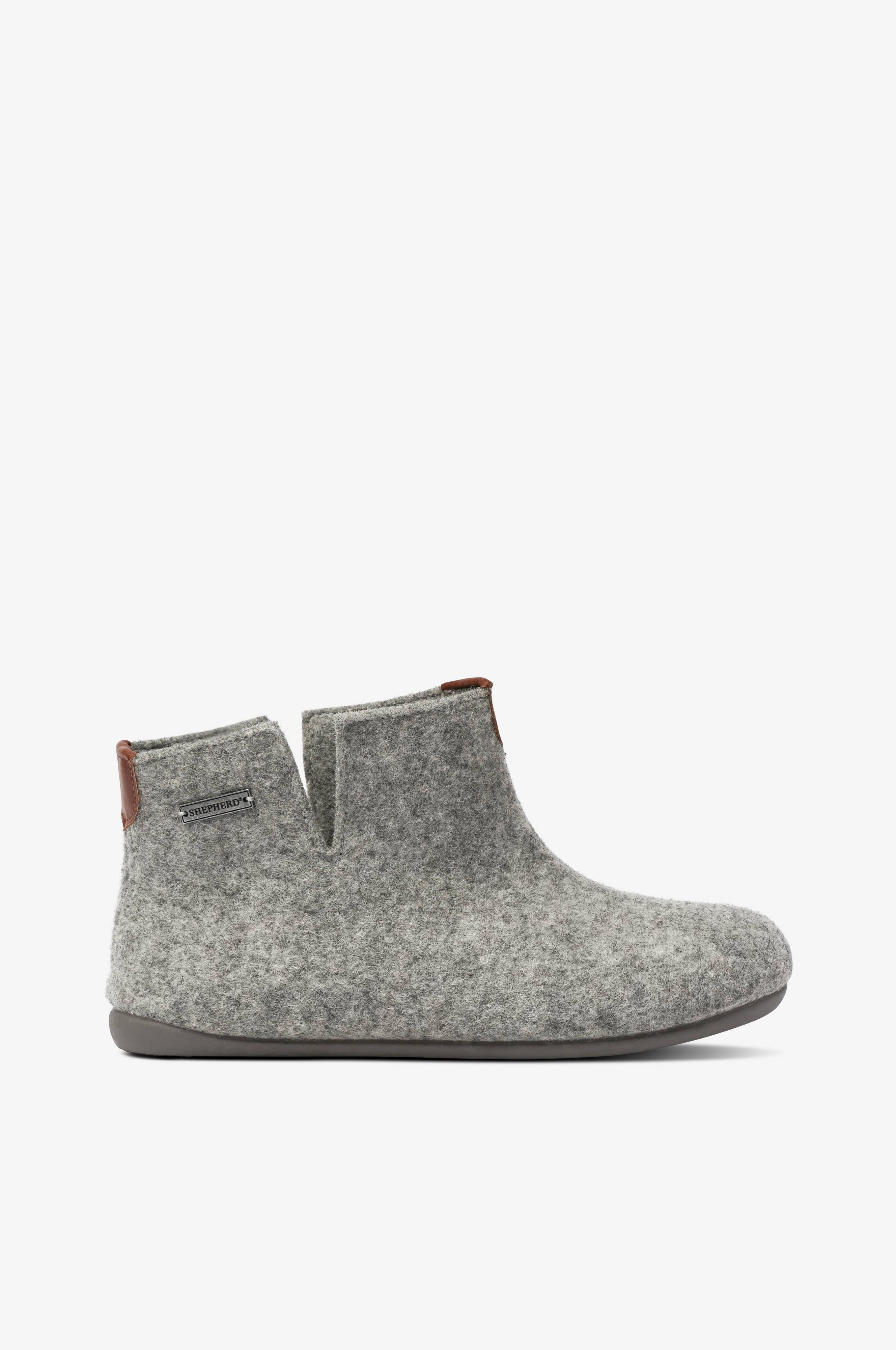 Hjemmesko i filtet uld med detaljer i skind på skaftet. Ankelhøj model med slids i siderne. Ydersål i gummi.