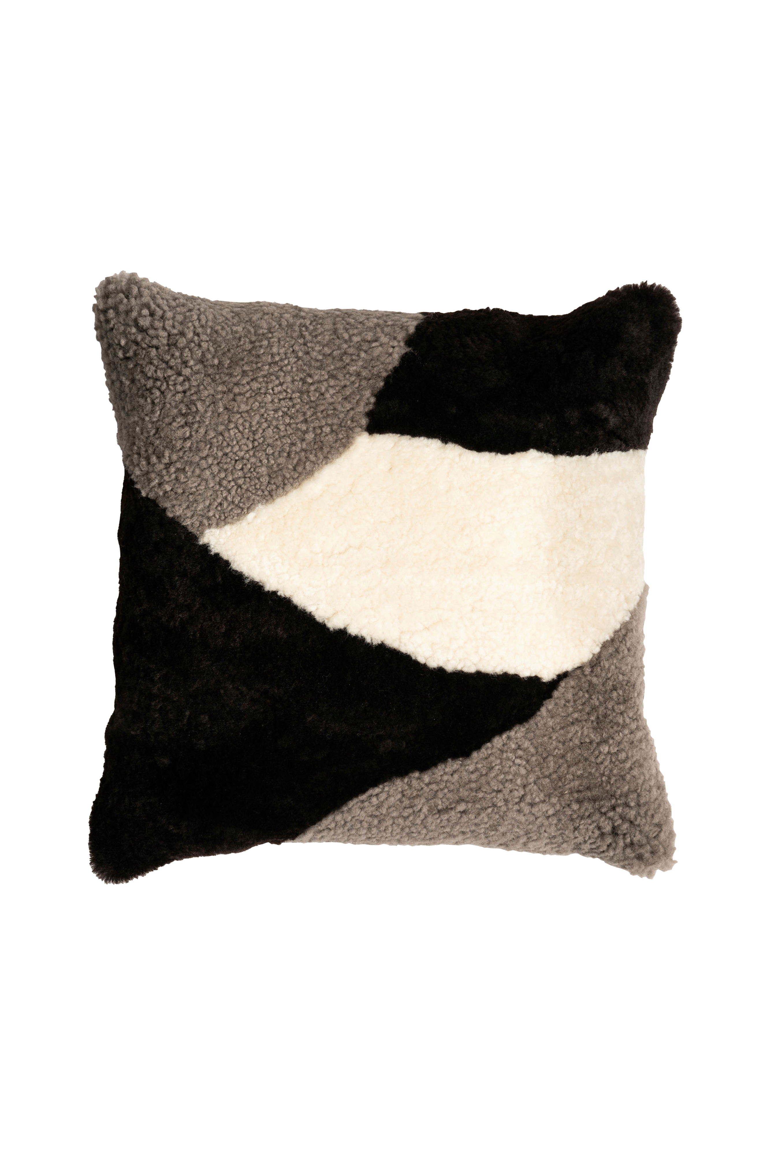 En mønstret pude i fåreskind. Bagsiden er lavet af vævet uld. Skjult lynlås. Alle fåreskind er naturlige, og derfor kan den naturlige tekstur variere fra stykke til stykke. Inderside i polyesterblanding med 50 % silikonepropper og 50 % andedun, som gør puden luftig og hjælper den med at holde formen. Længde: 50 cm, bredde: 50 cm