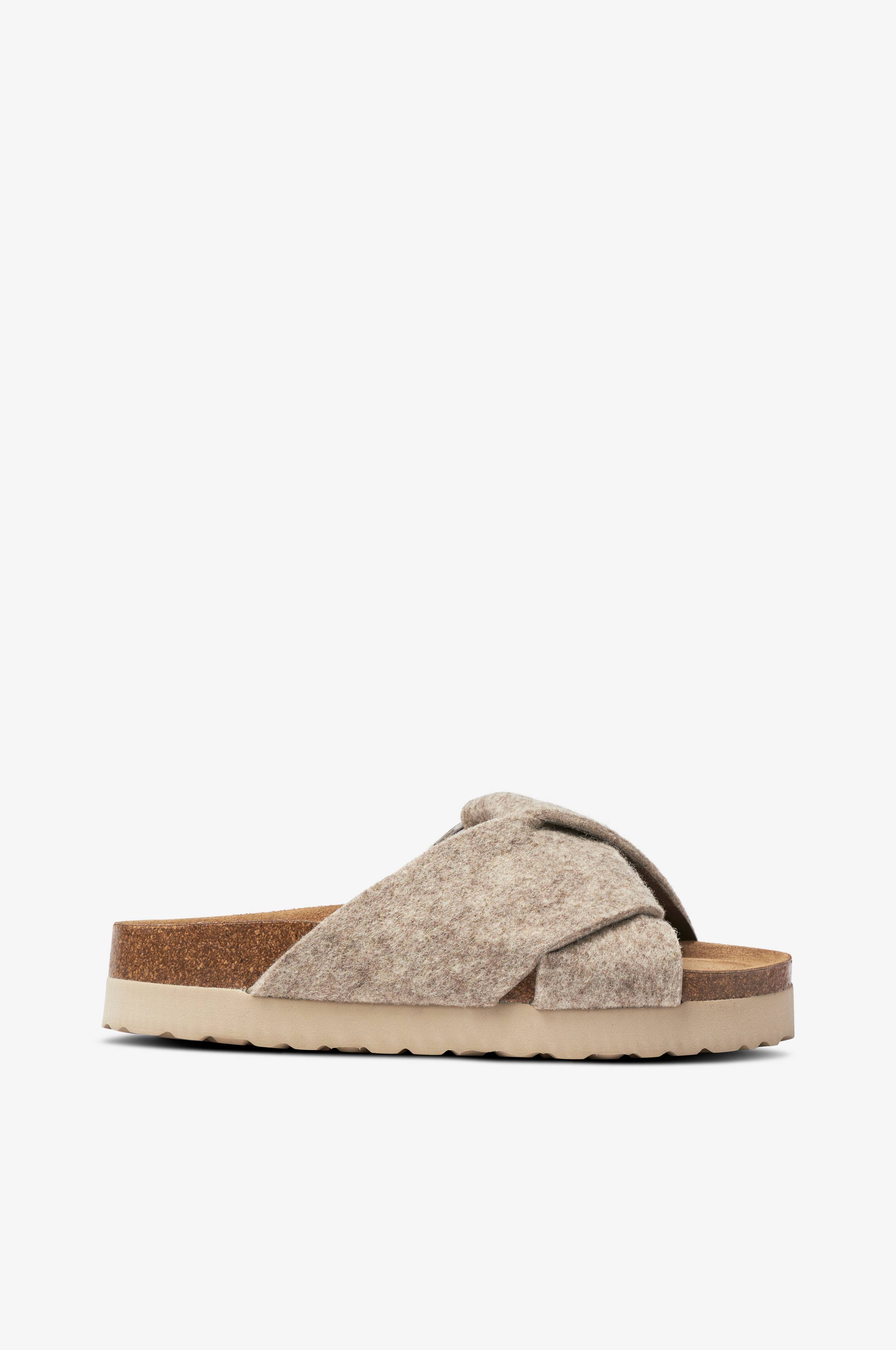 Sandaler i uld. Anatomisk udformet sål i kork beklædt med ruskind. Mønstret ydersål.