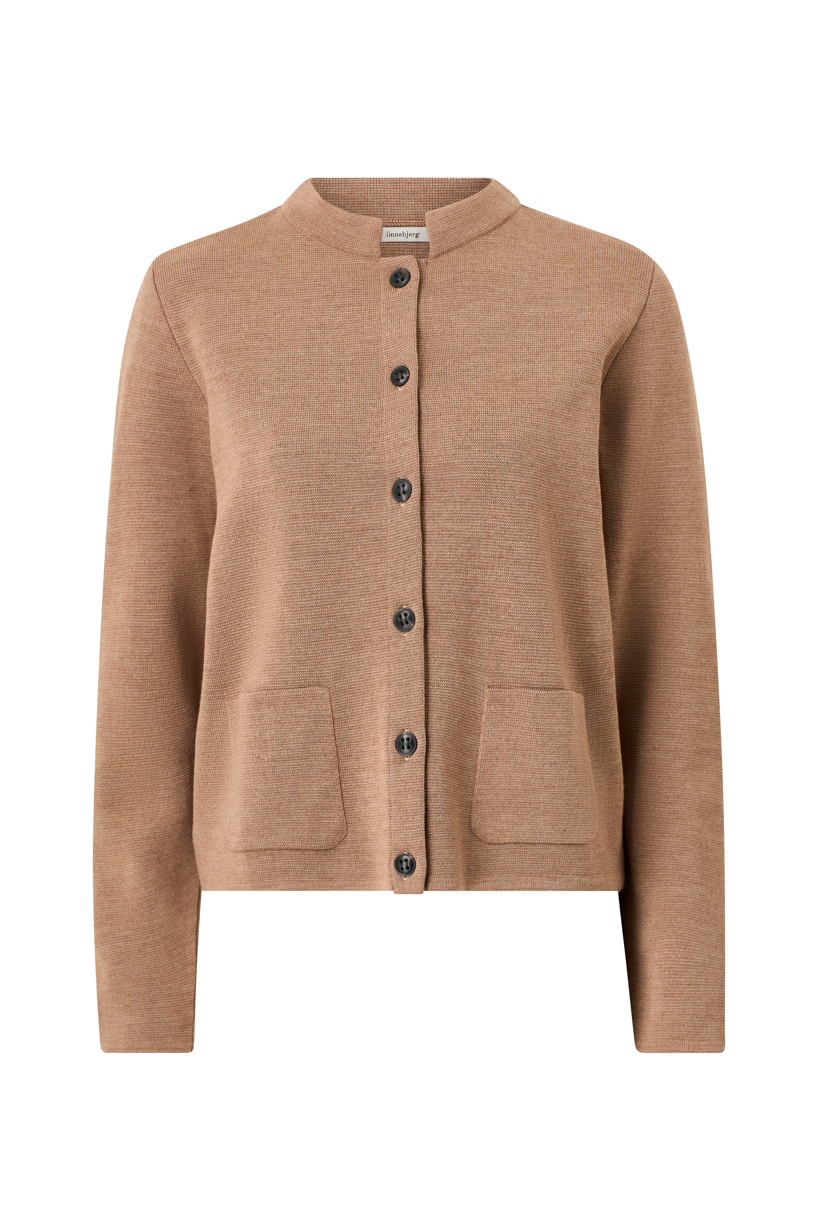 • Fintstrikket cardigan i merinouldblanding med opretstående krave