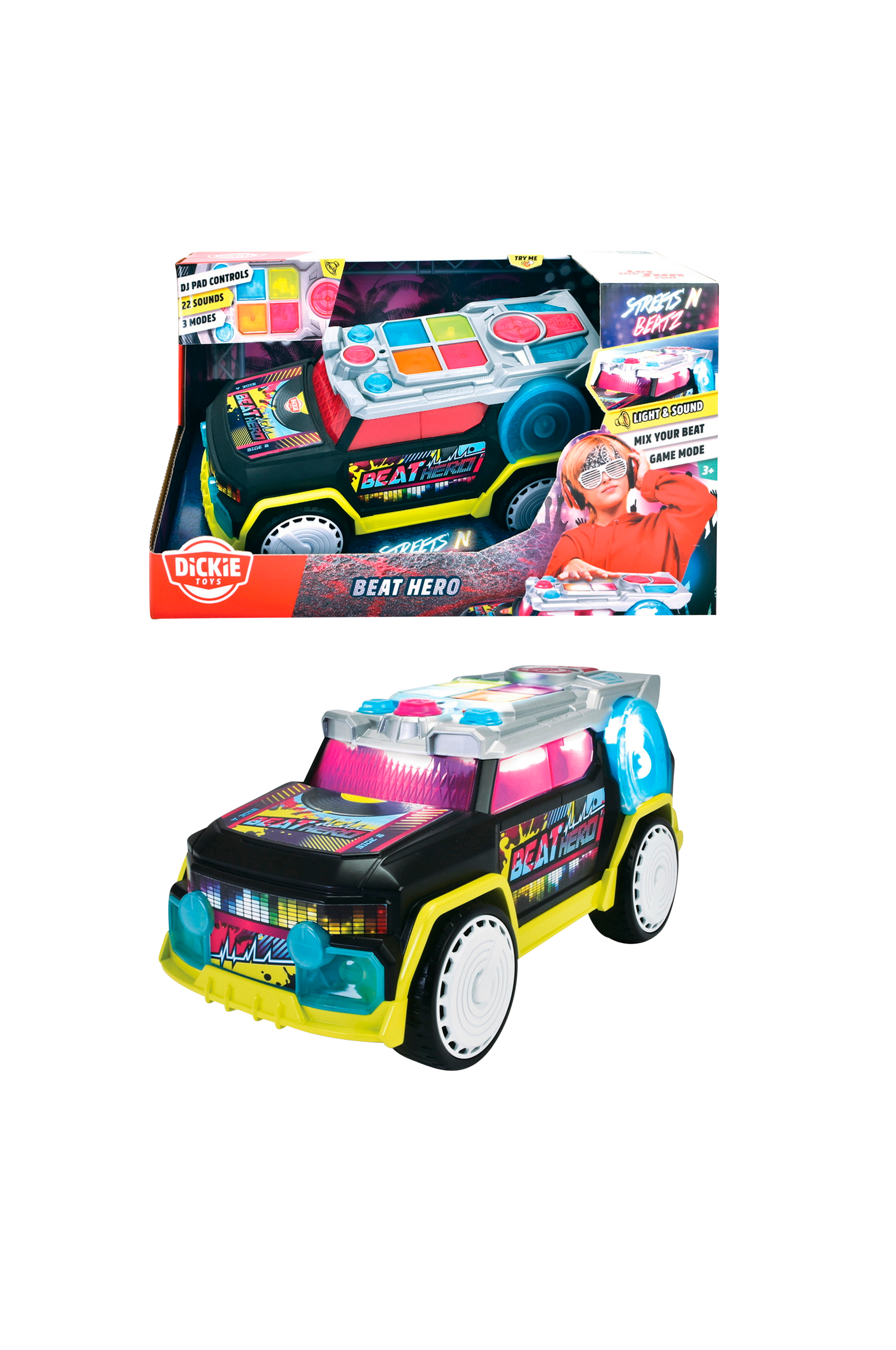 Beat Hero DJ-bilen har et cool og unikt look med mange funktioner. På taget er der en DJ-controller med 3 afspilningstilstande - freestyle, optagelse og bibliotek. Skab din egen musik med tre forskellige beats, 22 forskellige lyde, 3 forskellige tempi og 4 lydstyrkeniveauer.
