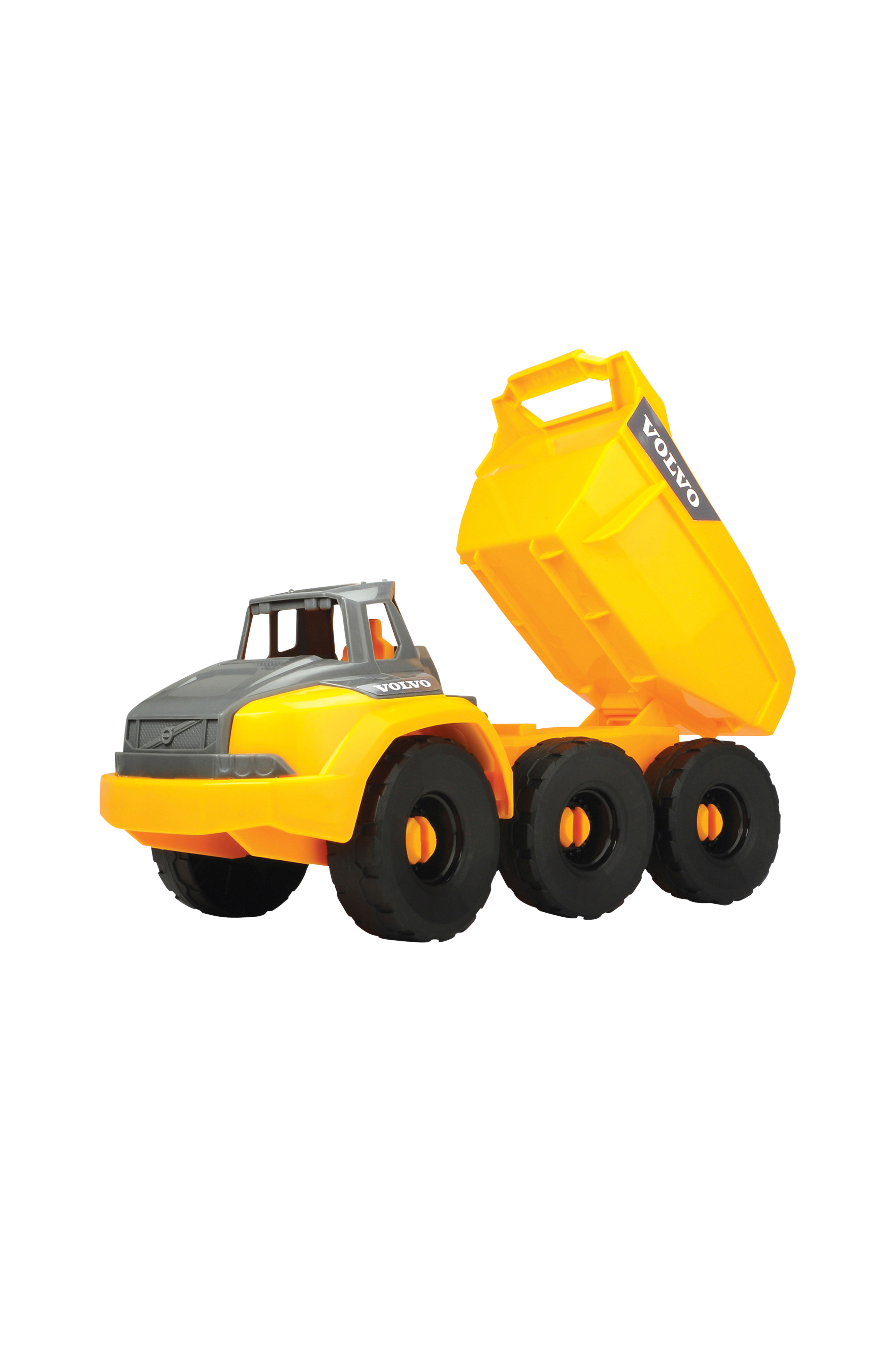 En sej tipvogn fra Dickie i Volvo-model med frihjul og førerhus, der kan åbnes. Skovlarmen er bevægelig og kan læsse og tippe.