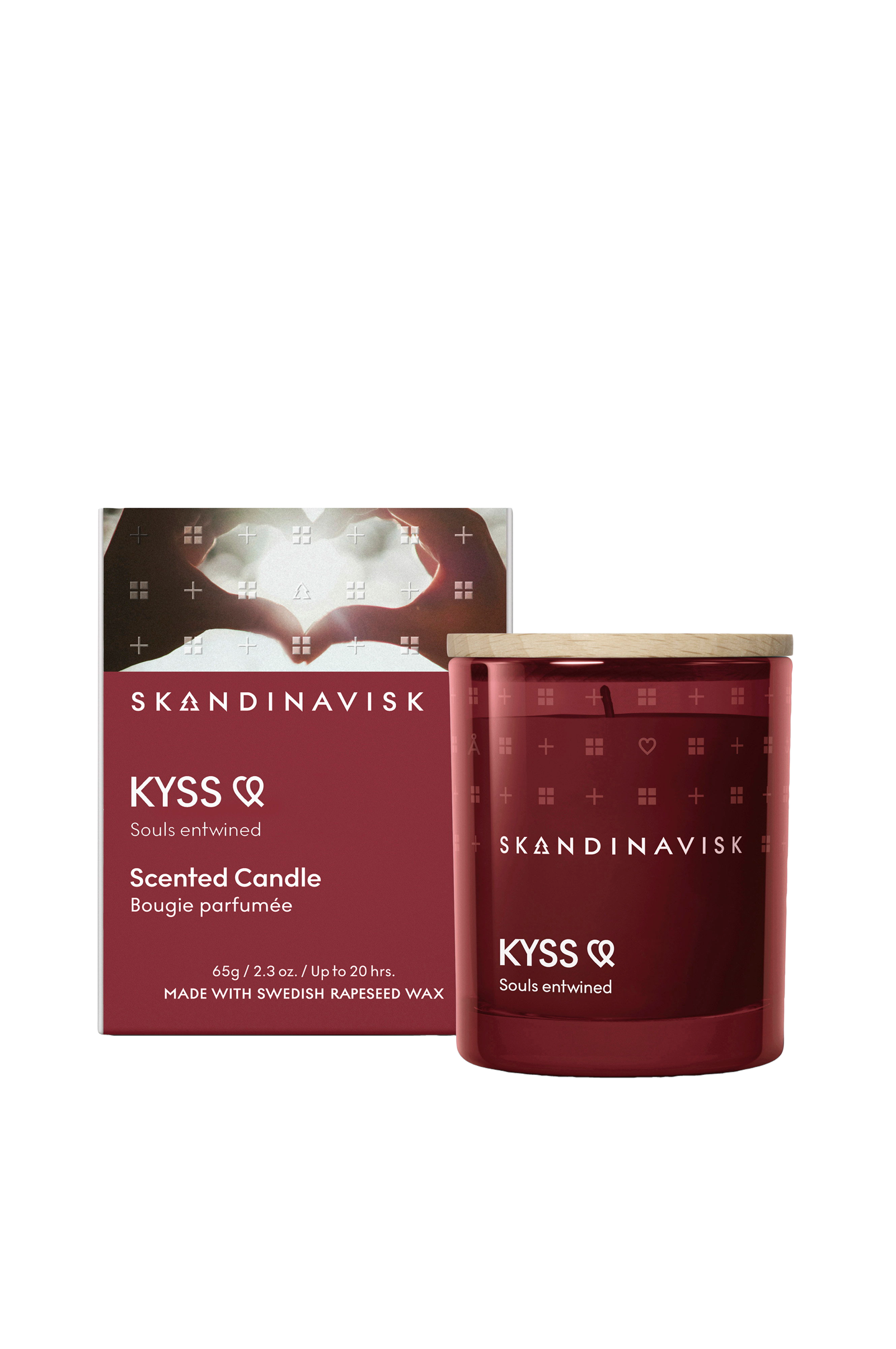 En blanding af parfume og svensk rapsvoks i malet glas med en væge af ren bomuld og et låg af indgraveret bøgetræ. Emballagekort fra forvaltede nordiske skove med vandbaserede farvestoffer.