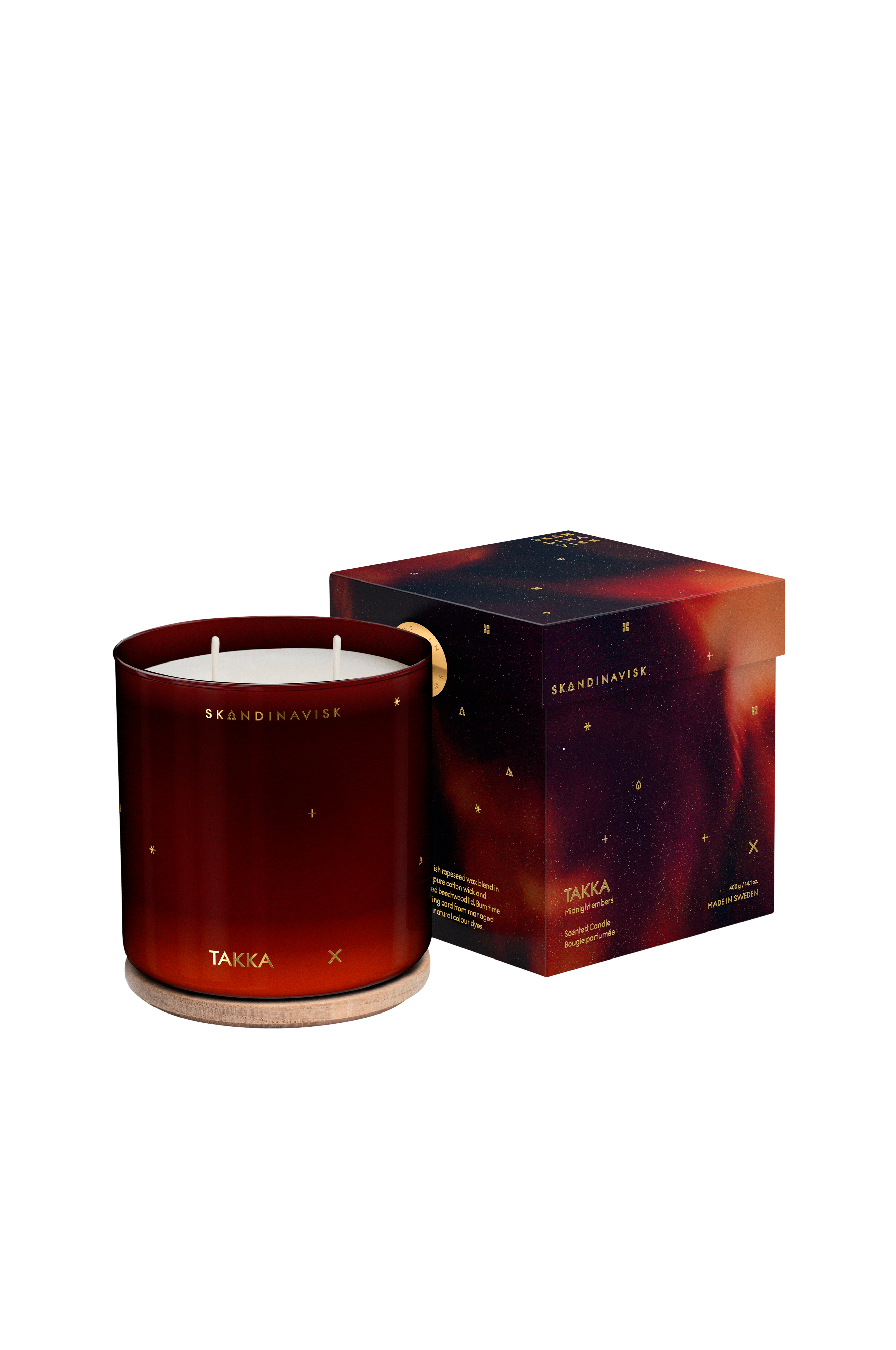 Duftlys med svensk rapsvoksblanding i farvet glas med ren bomuldsvæge og indgraveret FSC-certificeret egetræslåg.