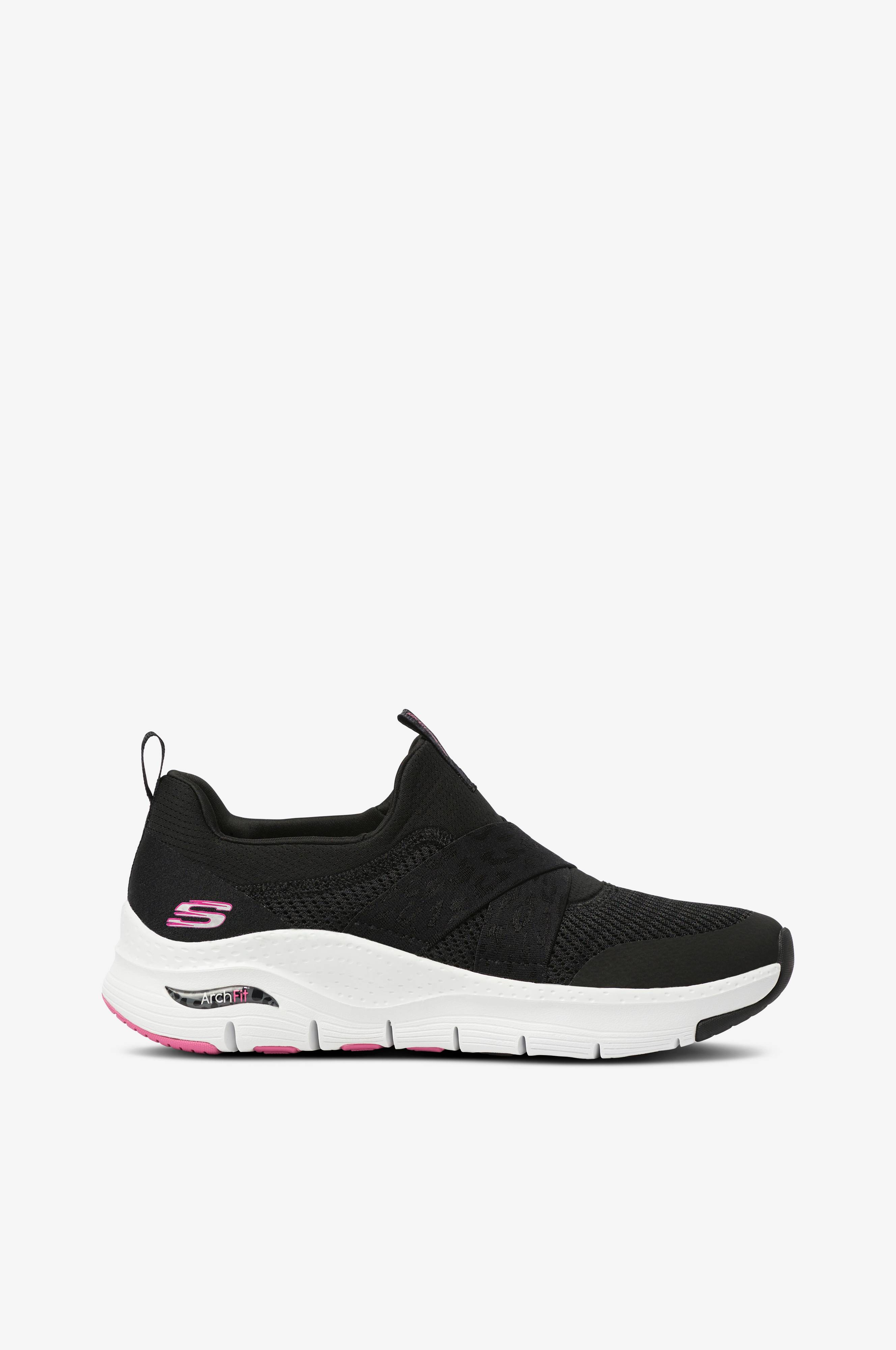Slip on-model i åndbar, luftkølet mesh med let vatterede partier for komfort. Krydsede, elastiske bånd med diskret leopardmønster for ekstra støtte. Patenteret Skechers Arch Fit-indersål med svangstøtte certifiere af fodplejeeksperter. Indersålen er udtagelig og former sig efter foden for give optimal støddæmpning og vægtfordeling. Fleksibel ydersål i gummi med godt greb. Tåler maskinvask. Hæl: 4 cm.