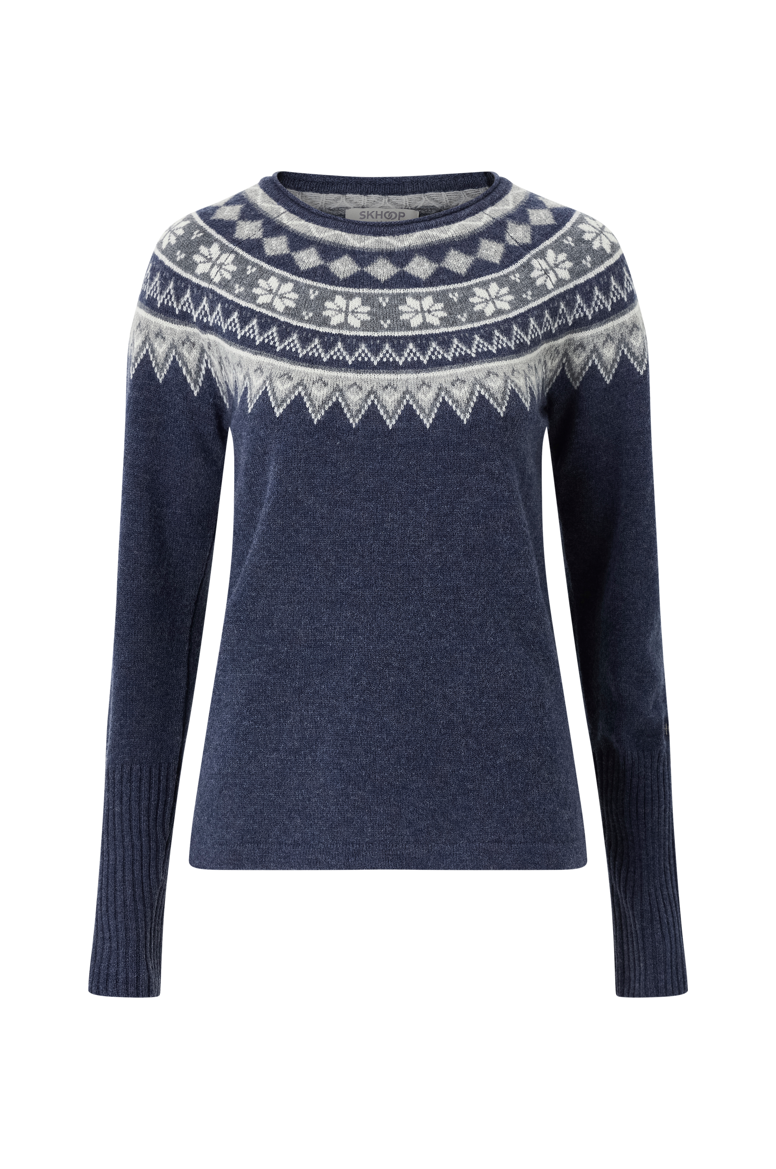 Trøje Scandinavian Sweater fra Skhoop. Flot model i glatstrikket uldblanding med rundstrikket mønster foroven. Rund hals med ribstrik og rullekant og ekstra langt ærme med bred ribstrik i ærmekant.