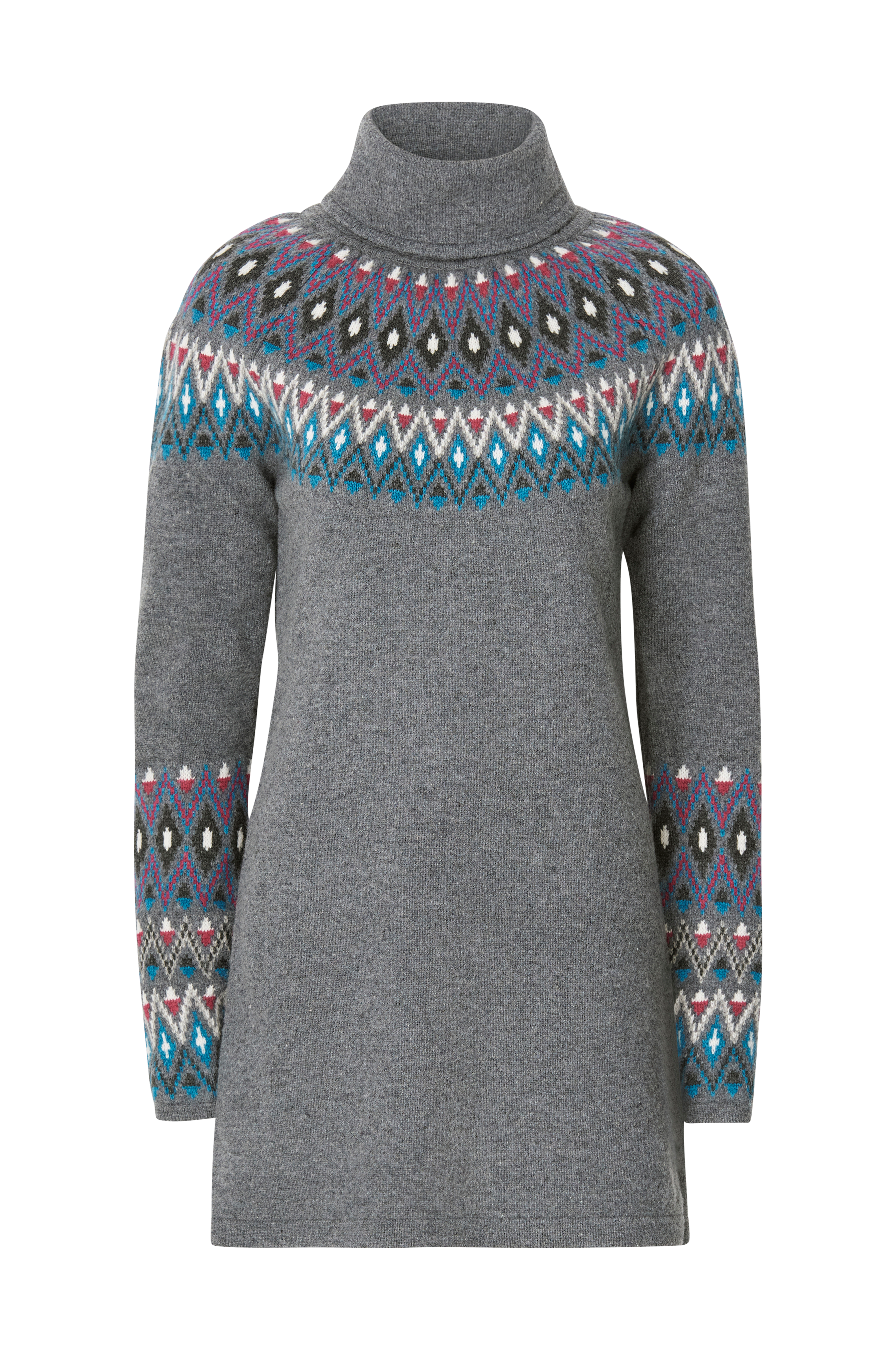 Strikket tunika eller kjole fra Skhoop i lammeuldsblanding med høj, varmende krave. Broderet Skhoop-logo på venstre ærme. Kanter i rib i ærmekant og forneden. Længde ca. 85 cm i str. S.