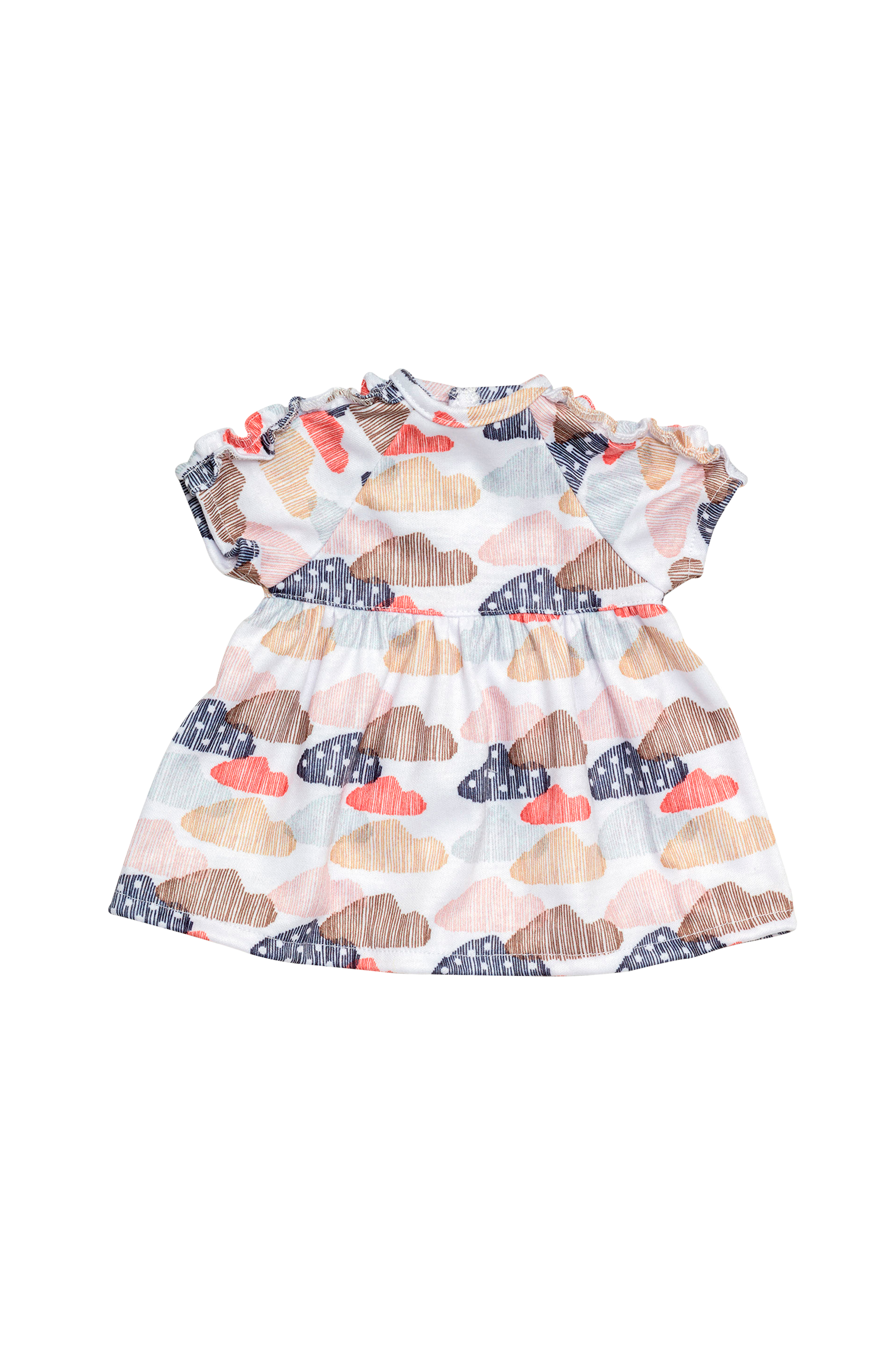 Dette er Lillans yndlingskjole i blød jersey med fine flæsedetaljer. Stoffet har et print af farvestrålende skyer i forskellige farver på hvid baggrund. Denne kjole kan bruges både til hverdag og fest!