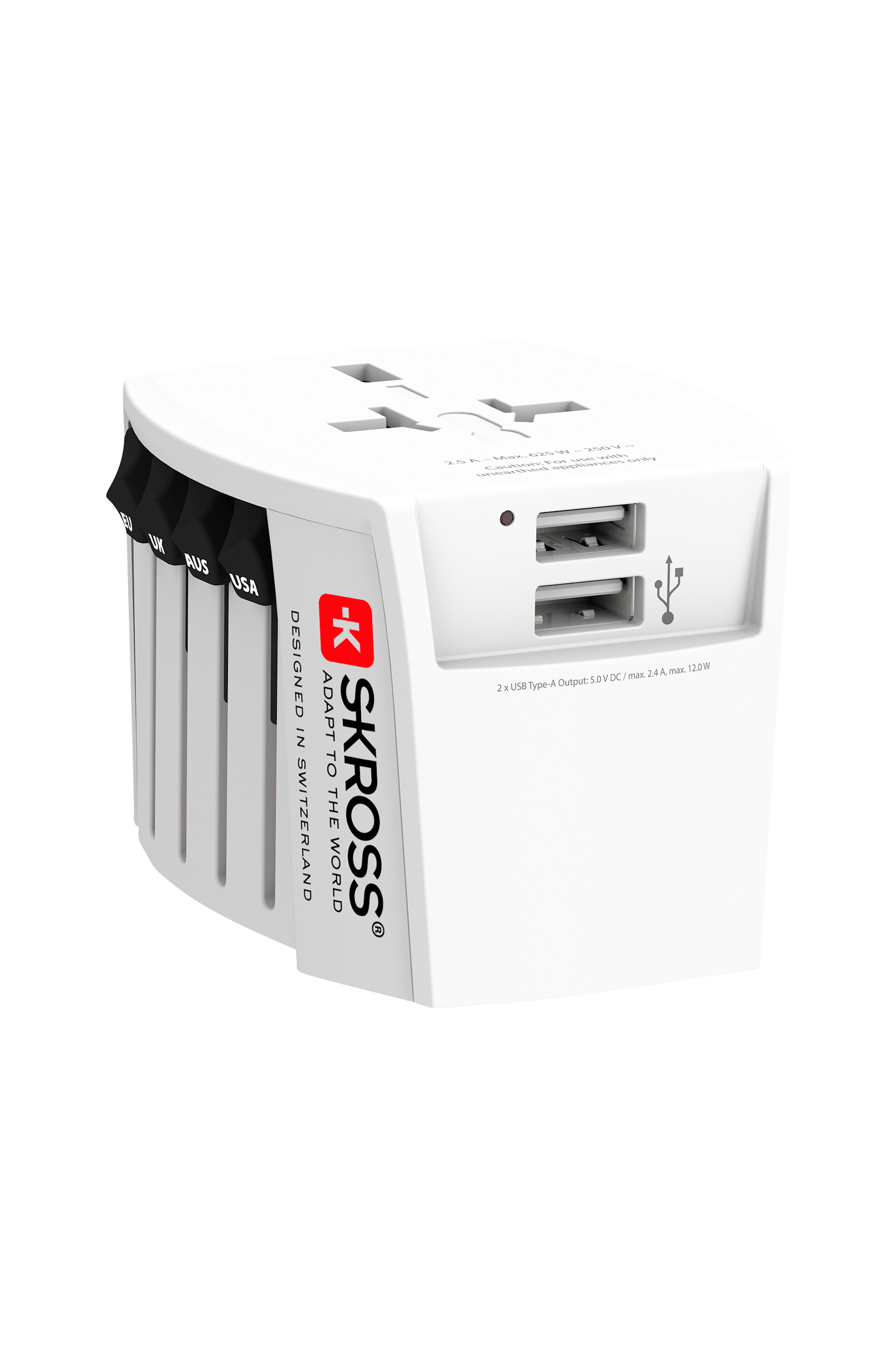 World Adapter MUV USB (2xA) fra SKROSS® gør det muligt for rejsende i hele verden at oplade to USB-enheder samtidigt sammen med en 2-polet enhed uden jordforbindelse. Denne kompakte adapter kan bruges på over 220 destinationer i hele verden.