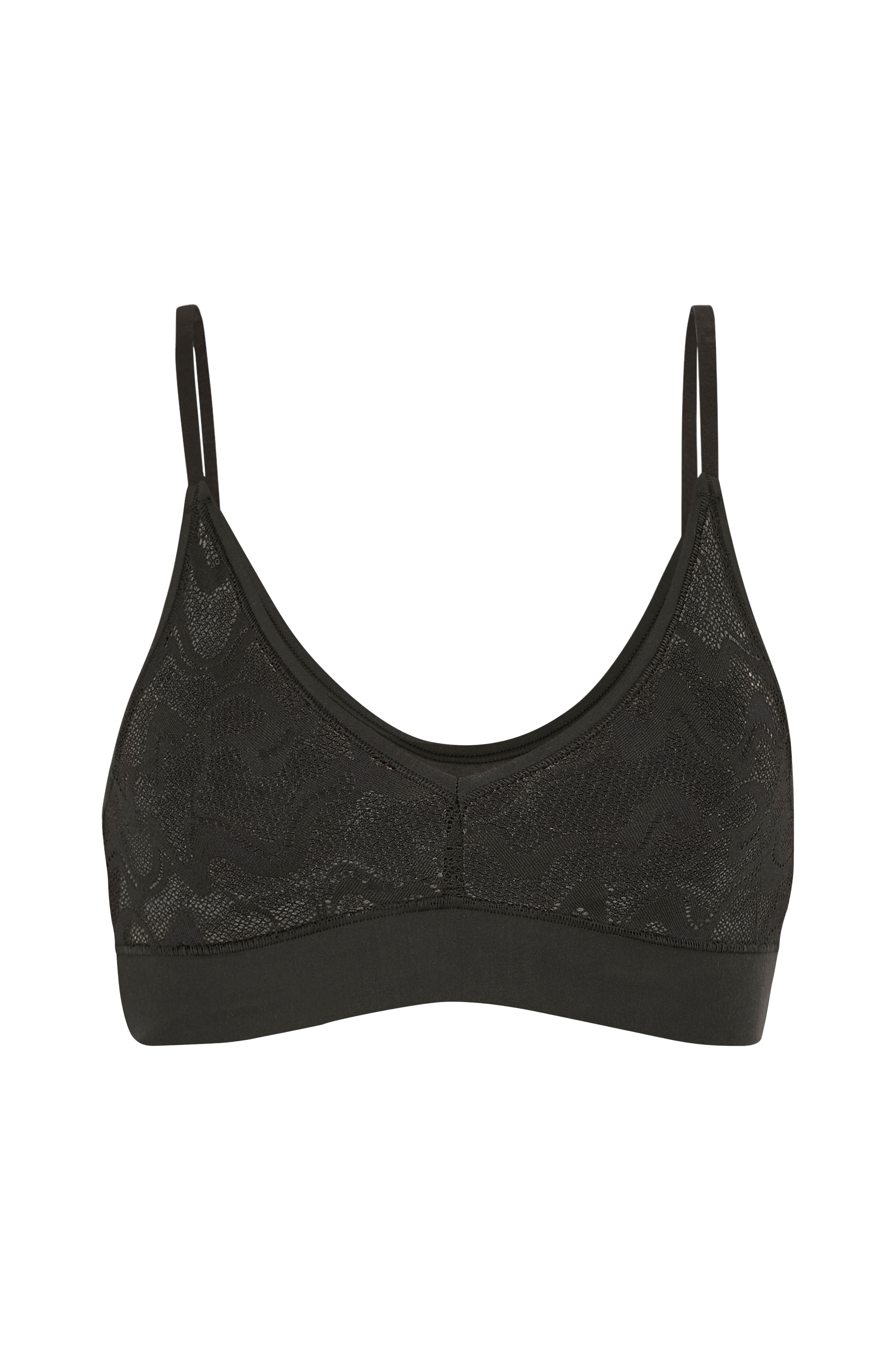 Vendbart design, hvor den ene side er i stretchblonde og den anden side i glat jersey. Blød elastik forneden. V-udskæring på den ene side og afrundet udskæring på den anden side.