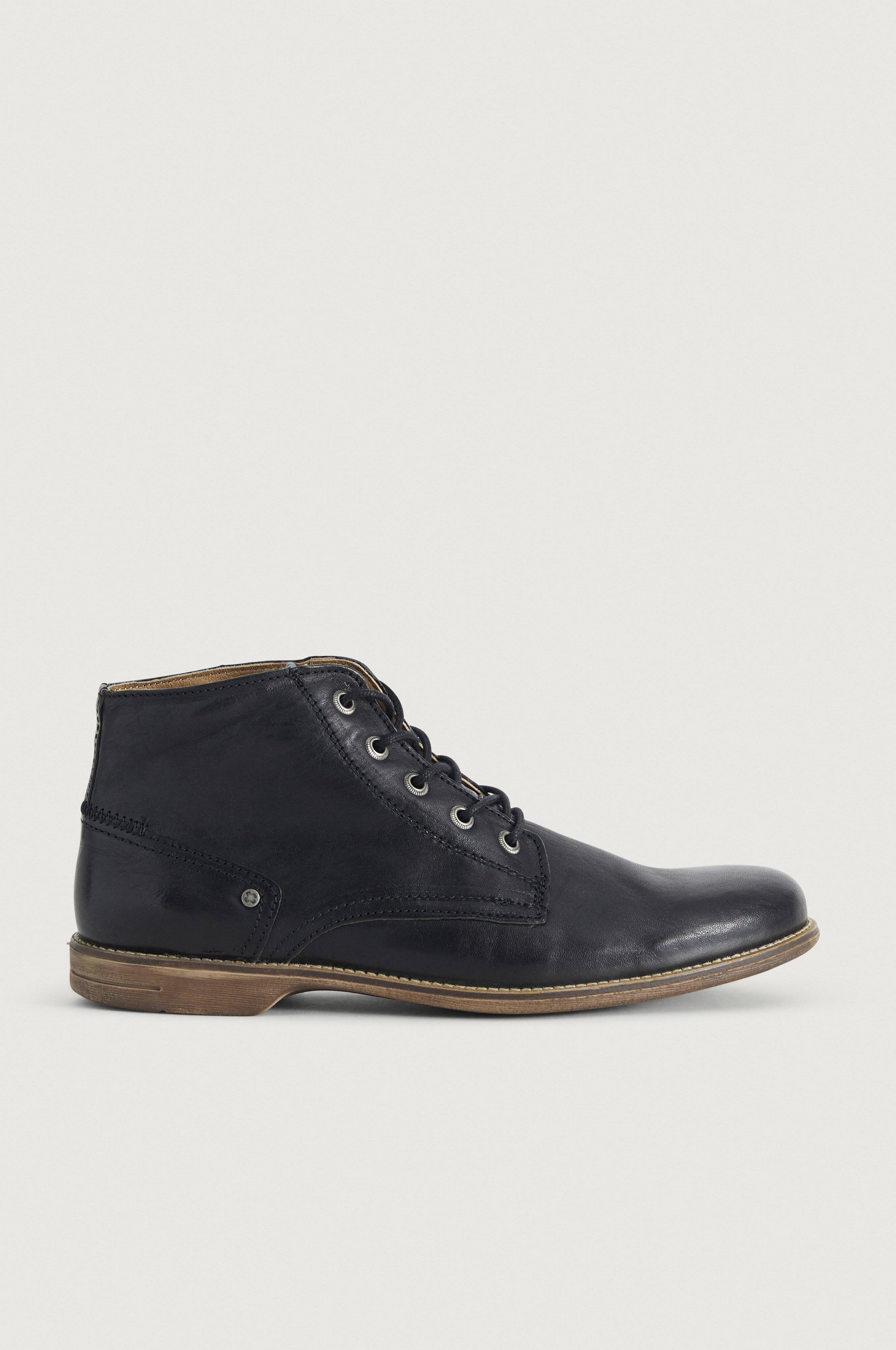 Ankelhøje, velforarbejdede Støvle Crasher Leather fra Sneaky Steve i økologisk skind med for i denim og indersål i microfiber. Dekorativ søm rundt i sålekanten. Snøre med runde snørebånd gennem metalsnørehuller. Afrundet tåform.