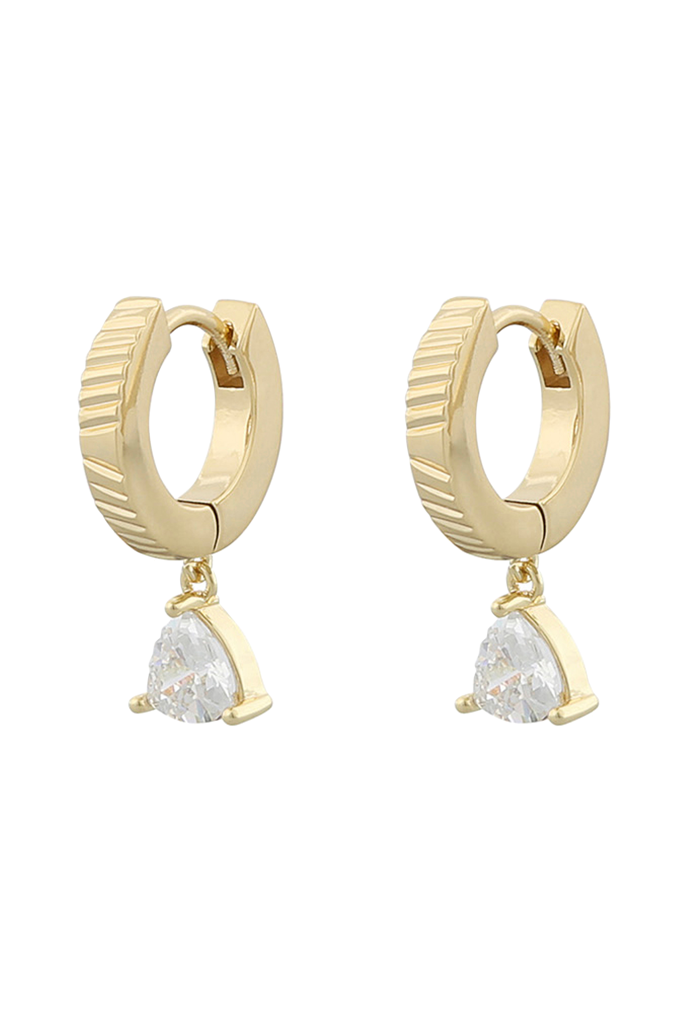 Elegante øreringe med et unikt design. Af guldpletteret messing med Cubic zirconia-sten. Diameter 14 mm, samlet højde inkl. vedhæng 22 mm.