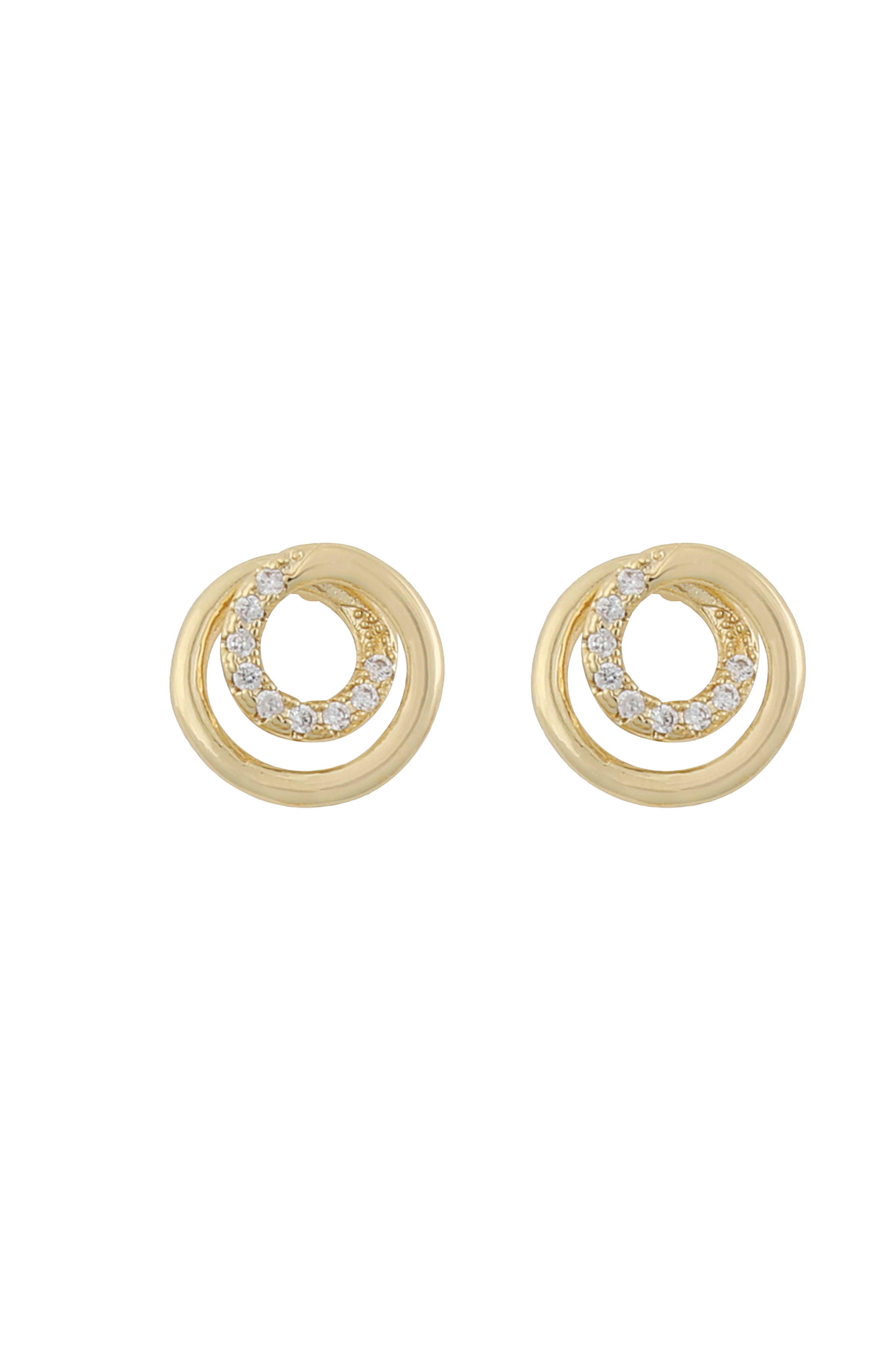 Klassiske små ørestikker i et stilrent design. Øreringene er snoede og har glitrende cubic zirconia-sten længst inde. Diameter 7 mm. Guldpletteret messing. Nikkeltestet.