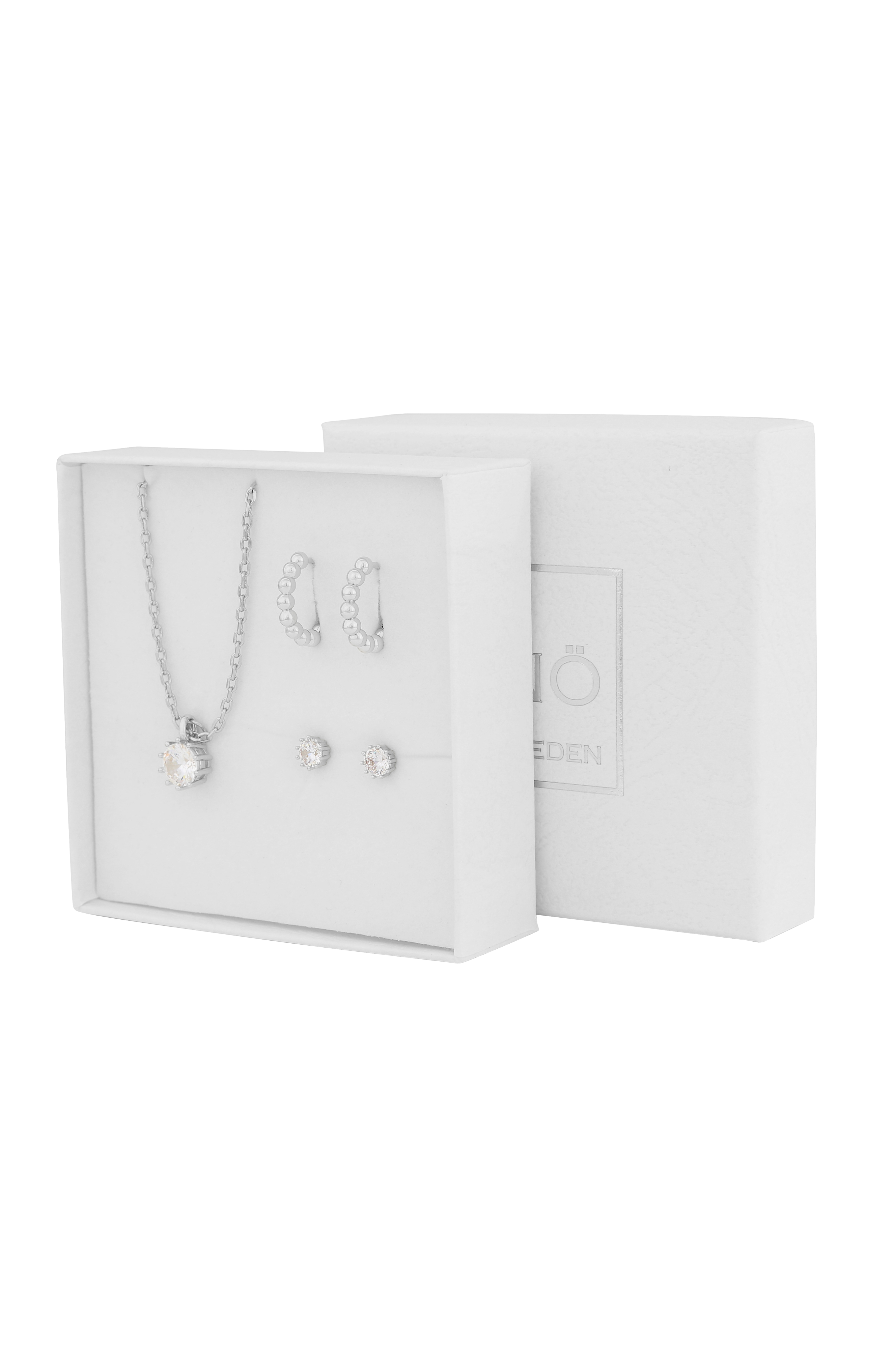 Dette sæt indeholder et par klassiske bøjleøreringe i et boblende design, et par øreringe med funklende cubic zirconia-sten og en tynd halskæde med en lille funklende cubic zirconia-sten. Fremstillet af sølvpletteret messing.