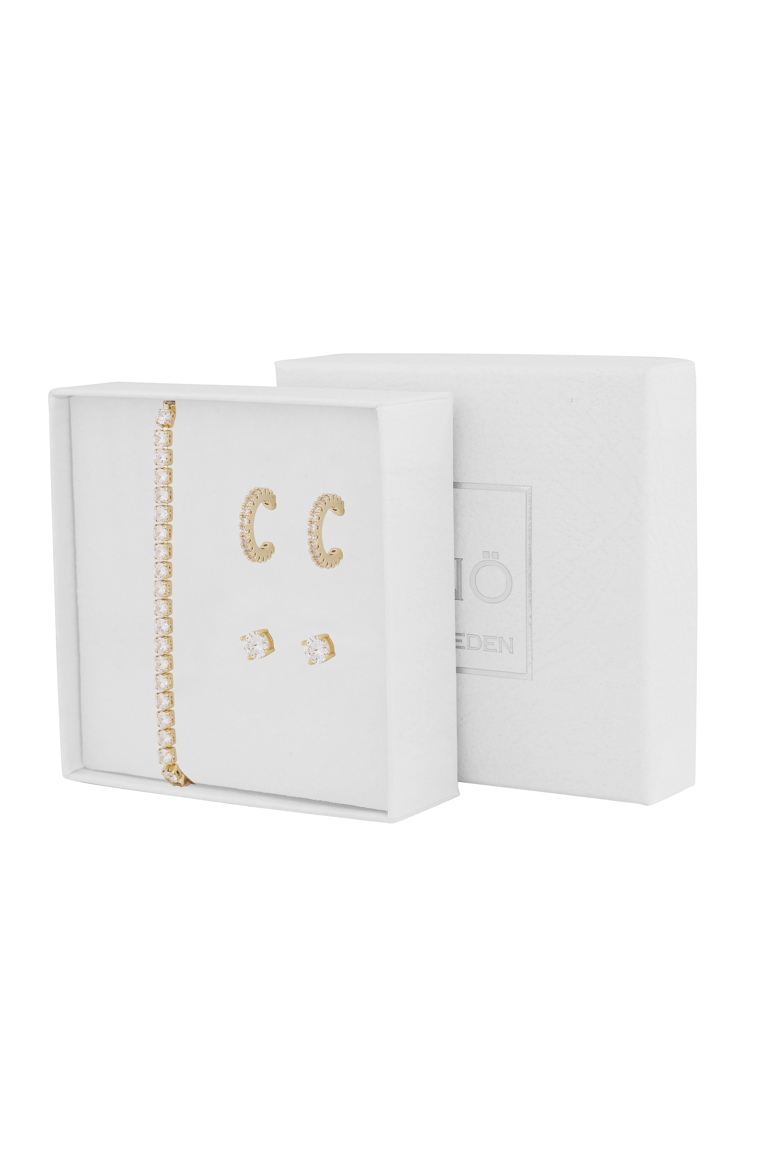 • Sæt med et armbånd og to øreringe• Stilrent design med kubisk zirkon• Fremstillet af guldbelagt messing• Leveres i en gaveæske