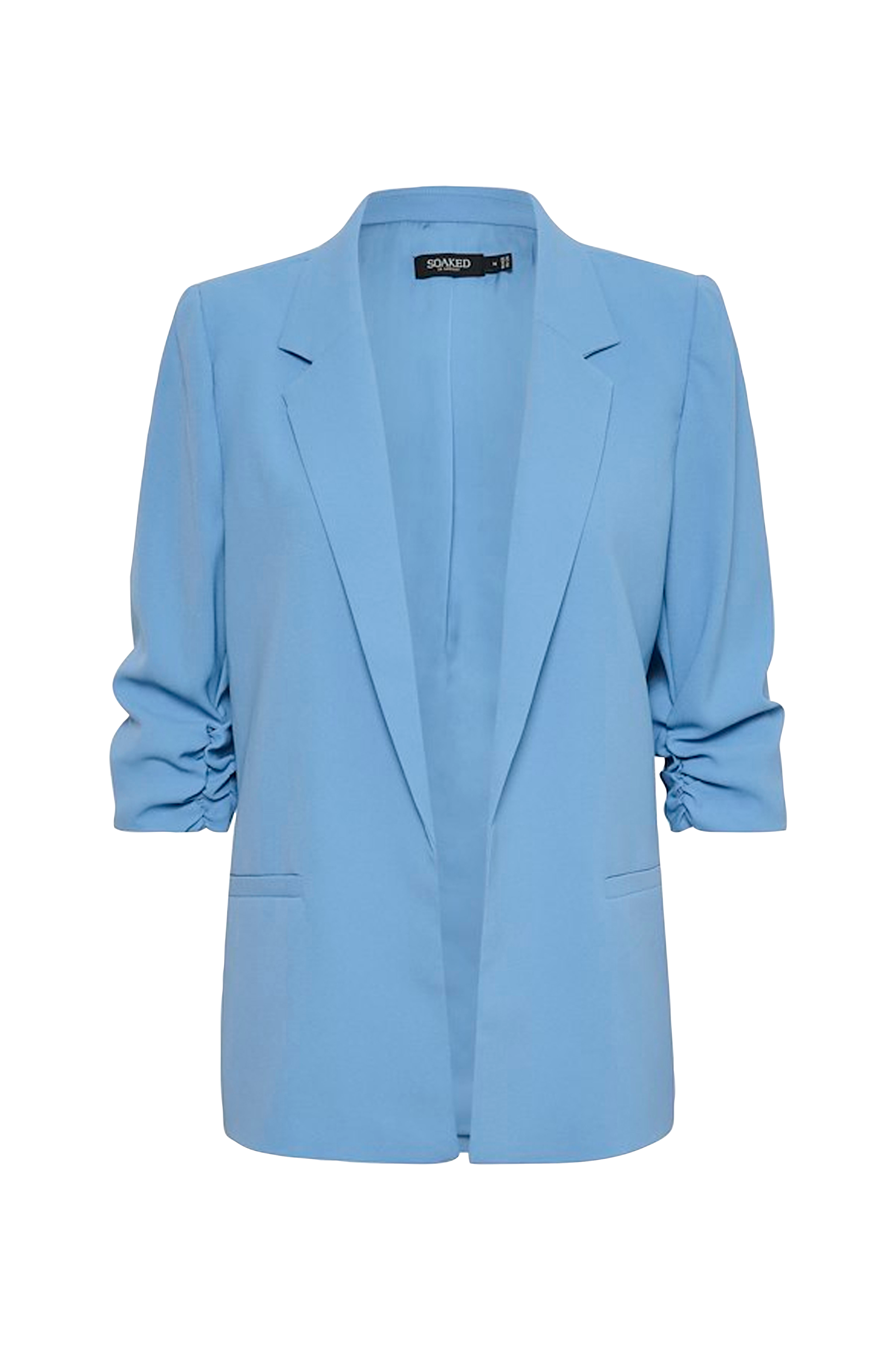 Blazer Shirley Blazer fra Soaked in Luxury i blødt materiale. Lige model som er åben foran. 3/4-lange ærmer med rynkning i ærmekant. To lommer foran. Længde ca. 67 cm i str. S.