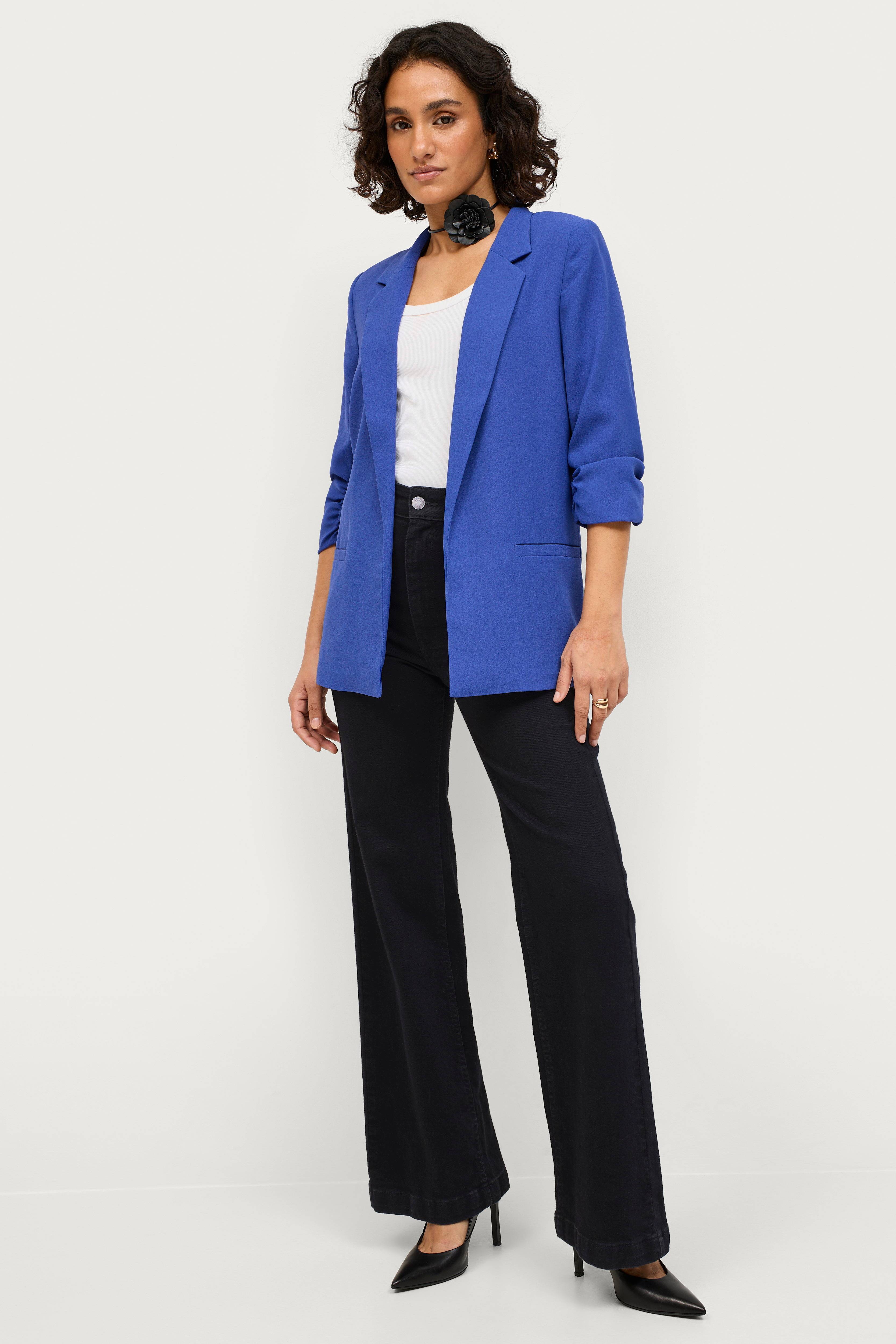 Blazer Shirley Blazer fra Soaked in Luxury i blødt materiale. Lige model som er åben foran. 3/4-lange ærmer med rynkning i ærmekant. To lommer foran. Længde ca. 67 cm i str. S.