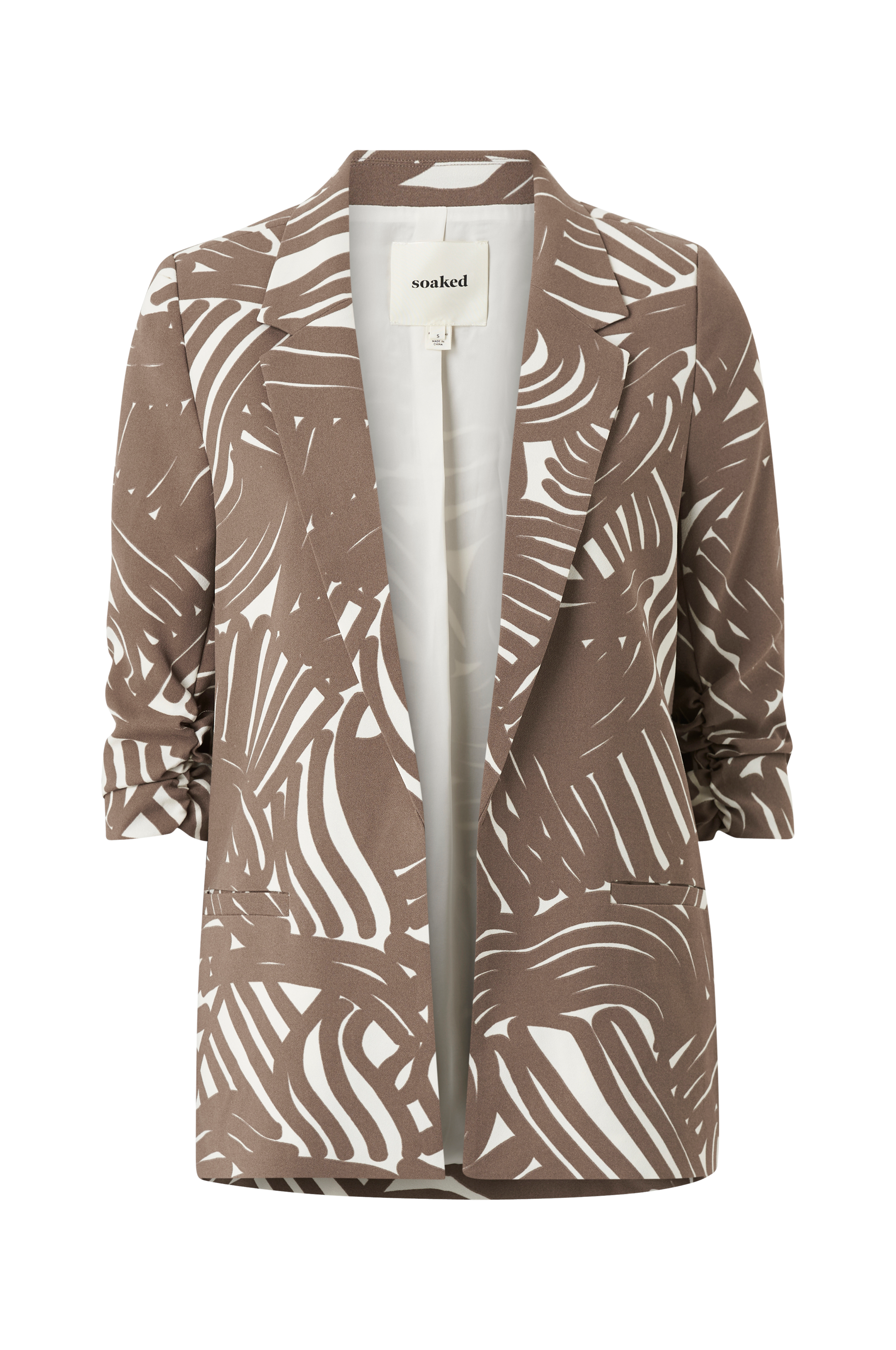 Blazer slShirley Printed Blazer fra Soaked in Luxury. Model uden lukning med krave og dyb revers samt 3/4-langt ærme med drapering forneden. To indsatte paspolerede lommer. Længde ca. 65 cm i str. S.