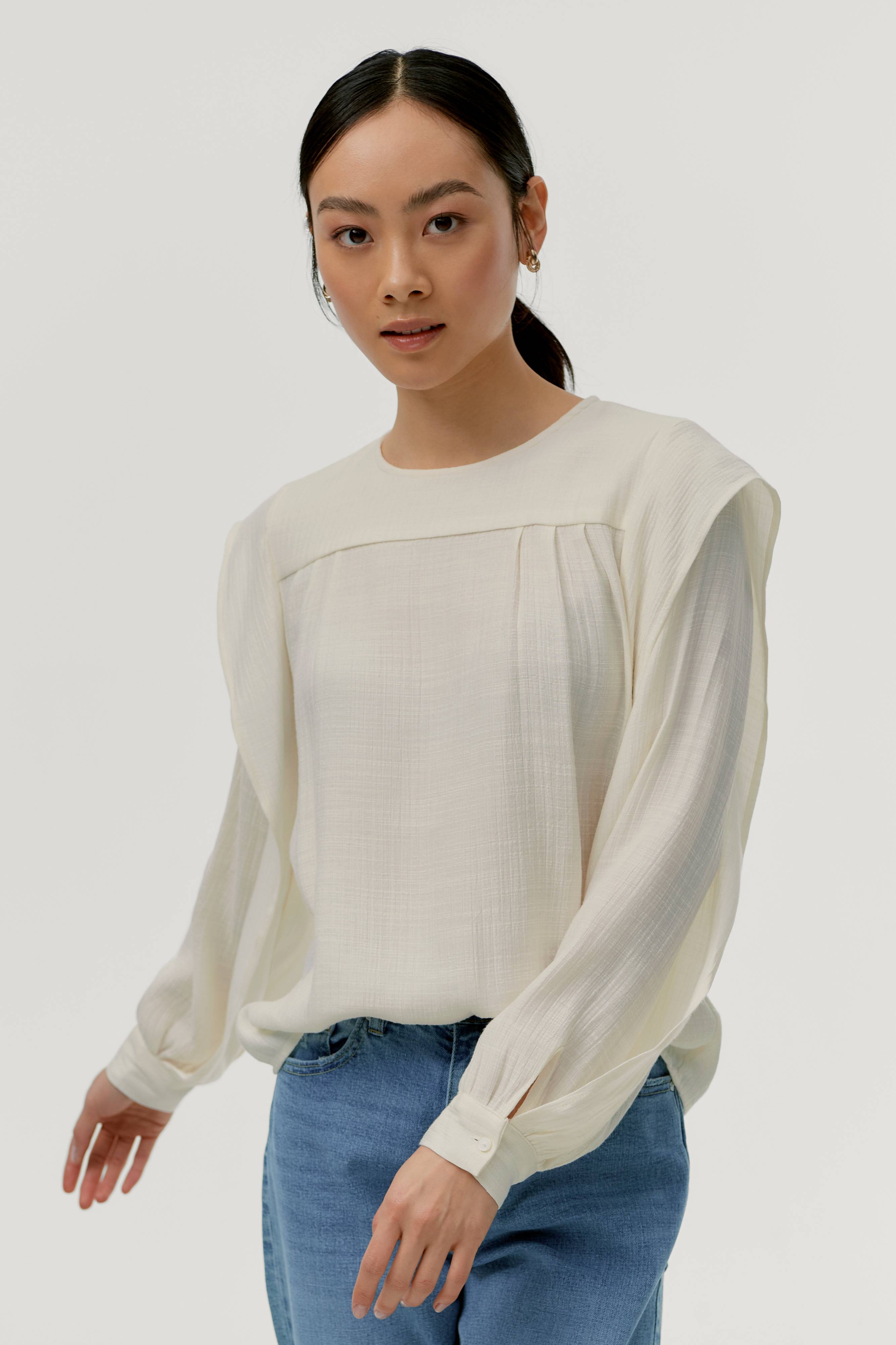 Lige oversizemodel med struktur i stoffet. Afskåret skulderbærestykke og rund hals med slids og knap i nakken. Vidt ærme med påsyet flæse på undersiden og op over skulderen samt manchet i ærmekant.