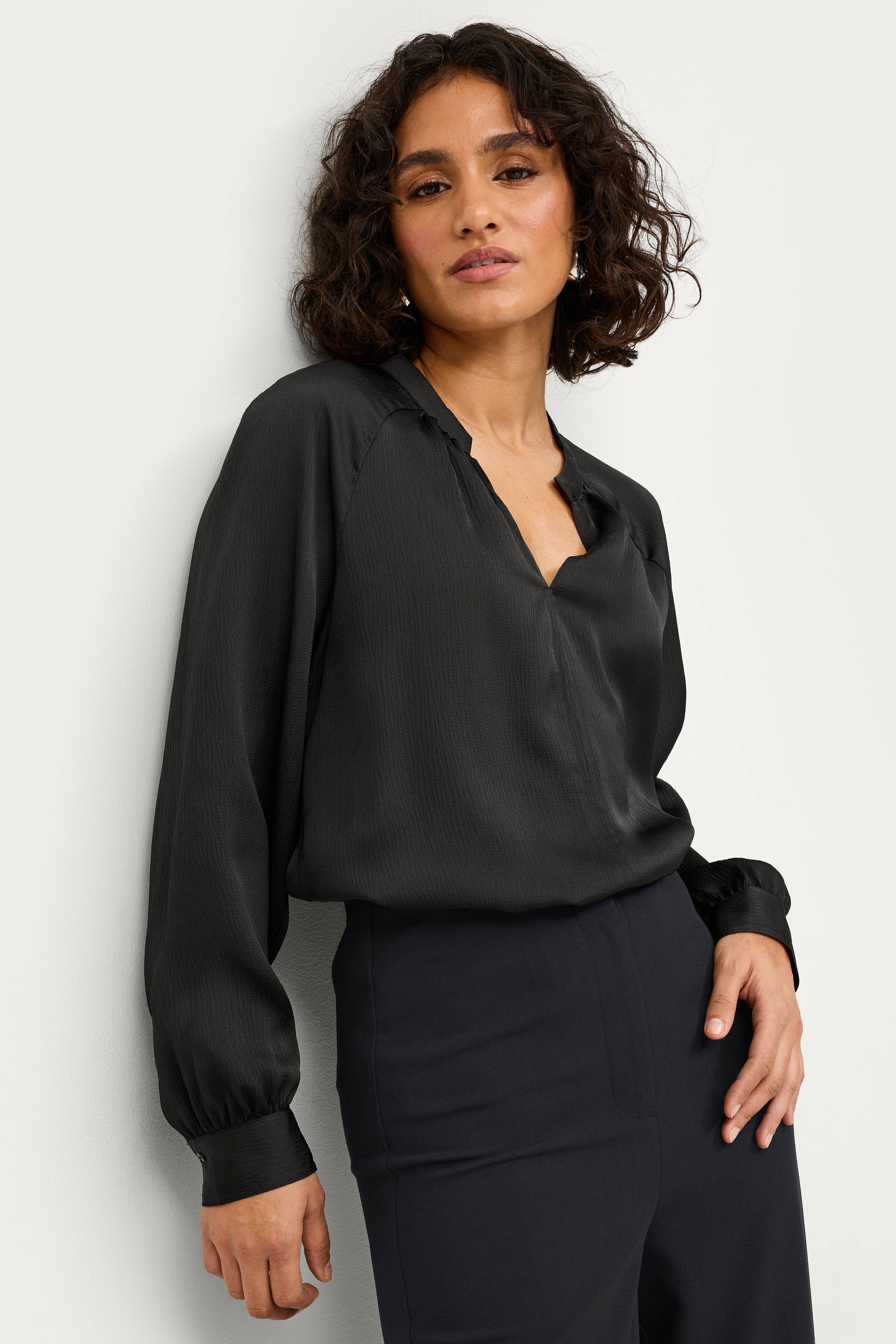 • V-udskæring• Raglanærmer• Kreppet kvalitet med glans