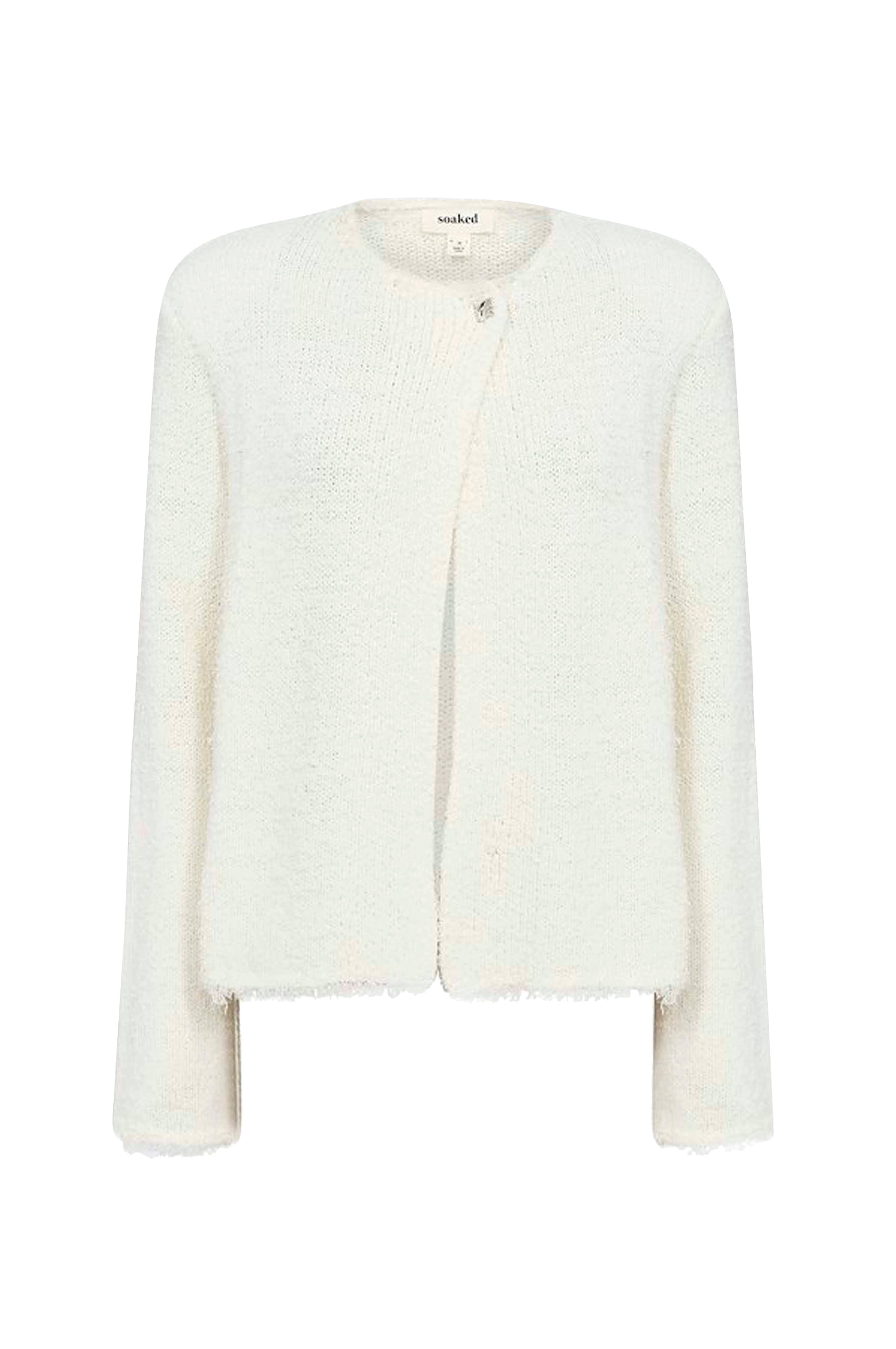 • Lige, uformel model i strukturel kvalitet• Rund hals• En dekorativ, sølvfarvet knap øverst• Skulderpuder• Langt, lige ærme• Frynsede kanter