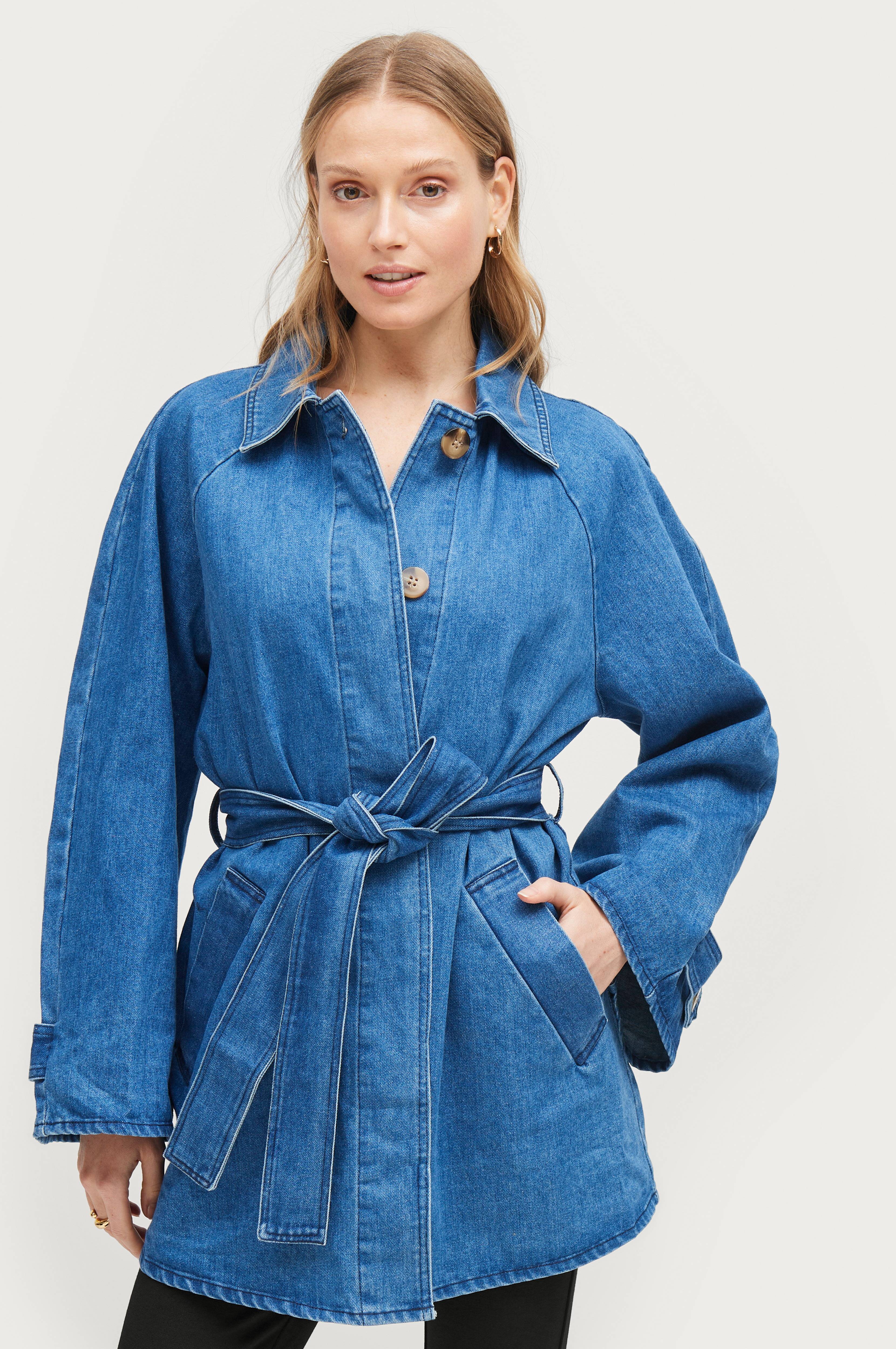 • Kort frakke i denim• Skjulte knapper foran• Brede raglanærmer med rem ved ærmeafslutningerne• To lommer• Bindebælte• Længde: 79 cm i størrelse S