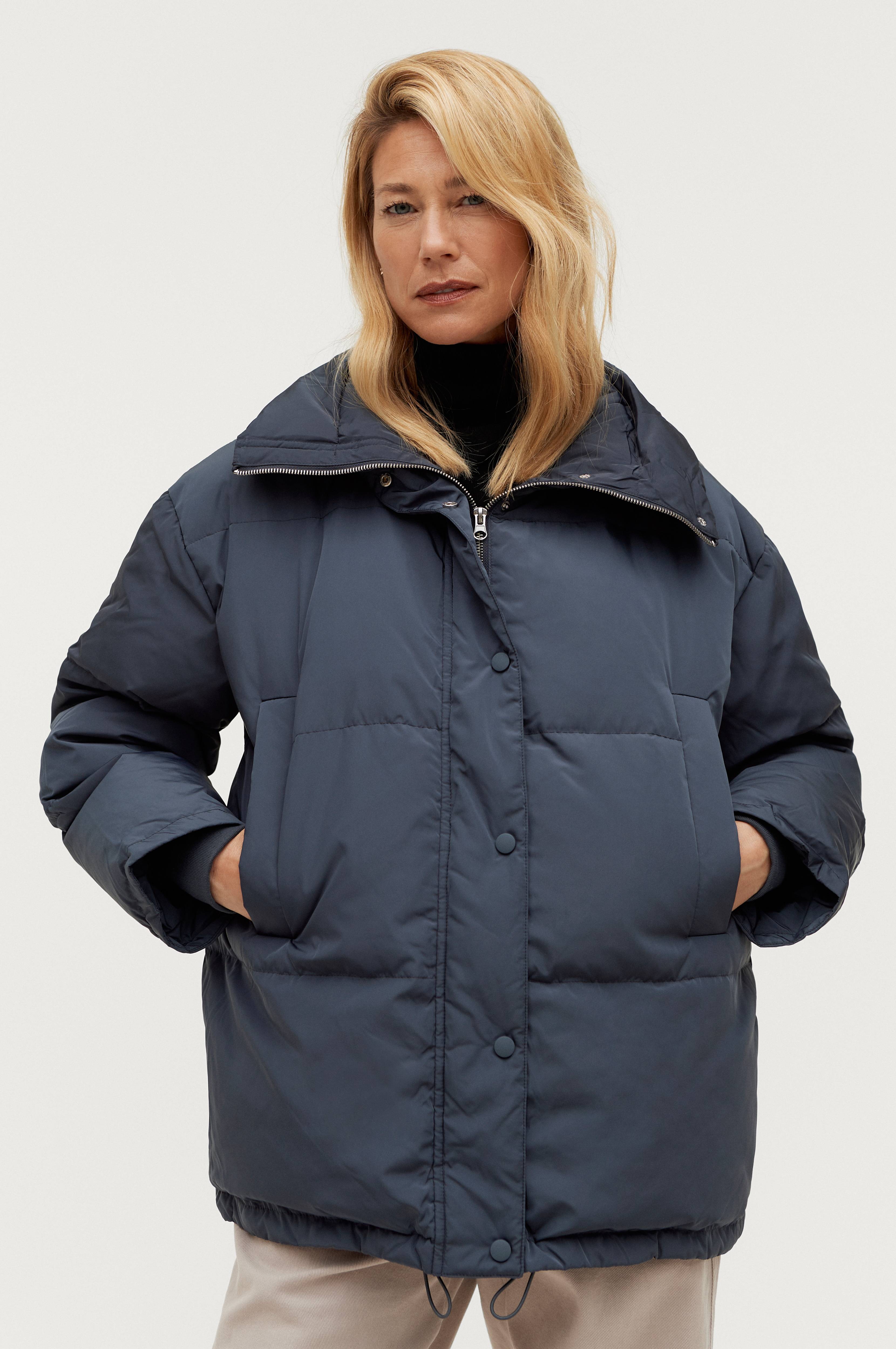 Dunjakke med let blankt yderstof og varmt fyld af 70% dun og 30% fjer. Høj sjalskrave. Lukning med lynlås og overfald med trykknapper. To lommer med trykknapper. Løbegang med stop i kanten forneden. Længde ca. 73 cm i str. S.