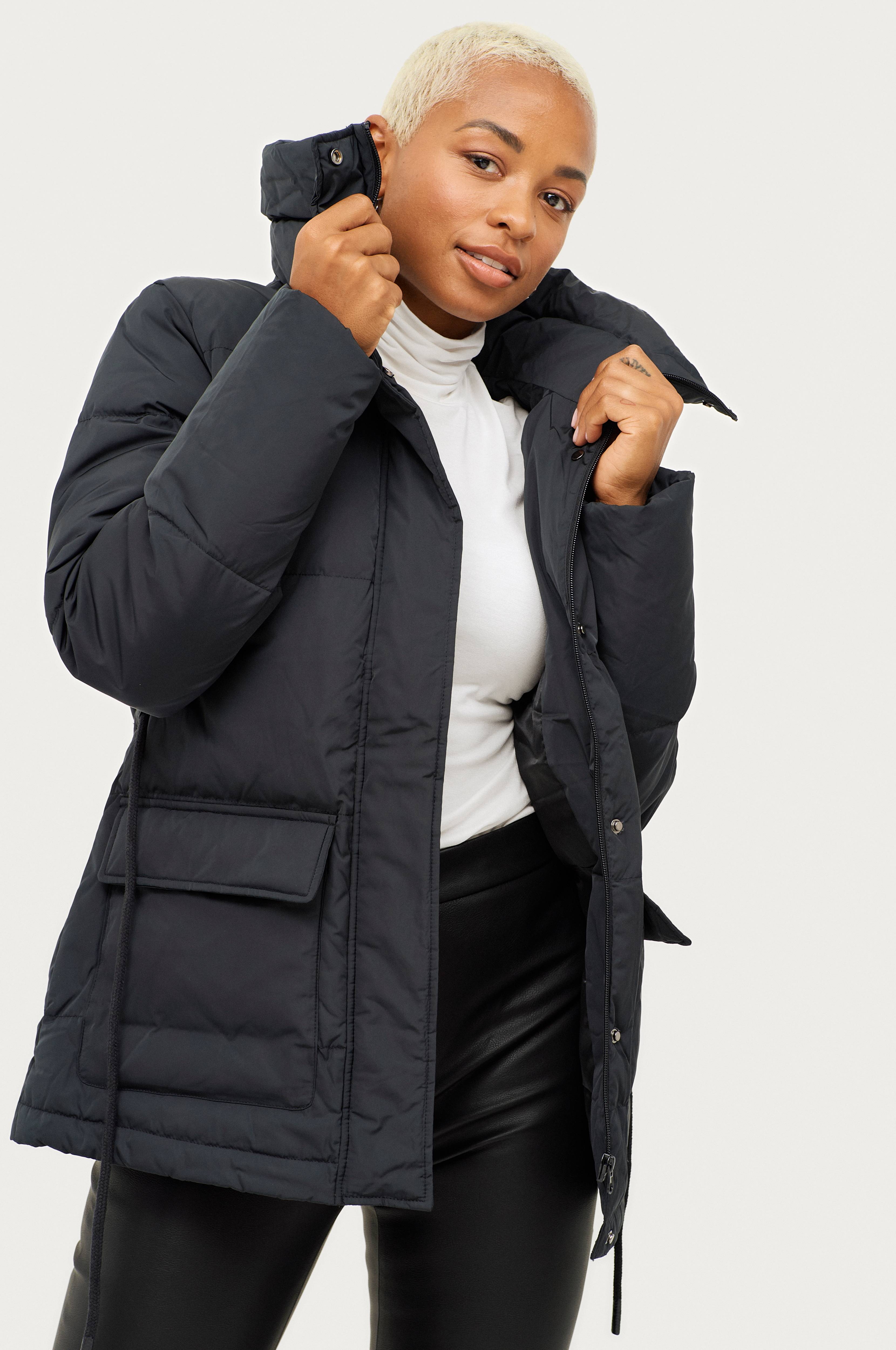 • Quiltet, foret jakke• Høj krave• Lynlås• Vindflap med trykknapper• To lommer med låg• Træksnørre ved taljen• Elastisk bånd ved manchetterne• Længde: 73 cm i størrelse S