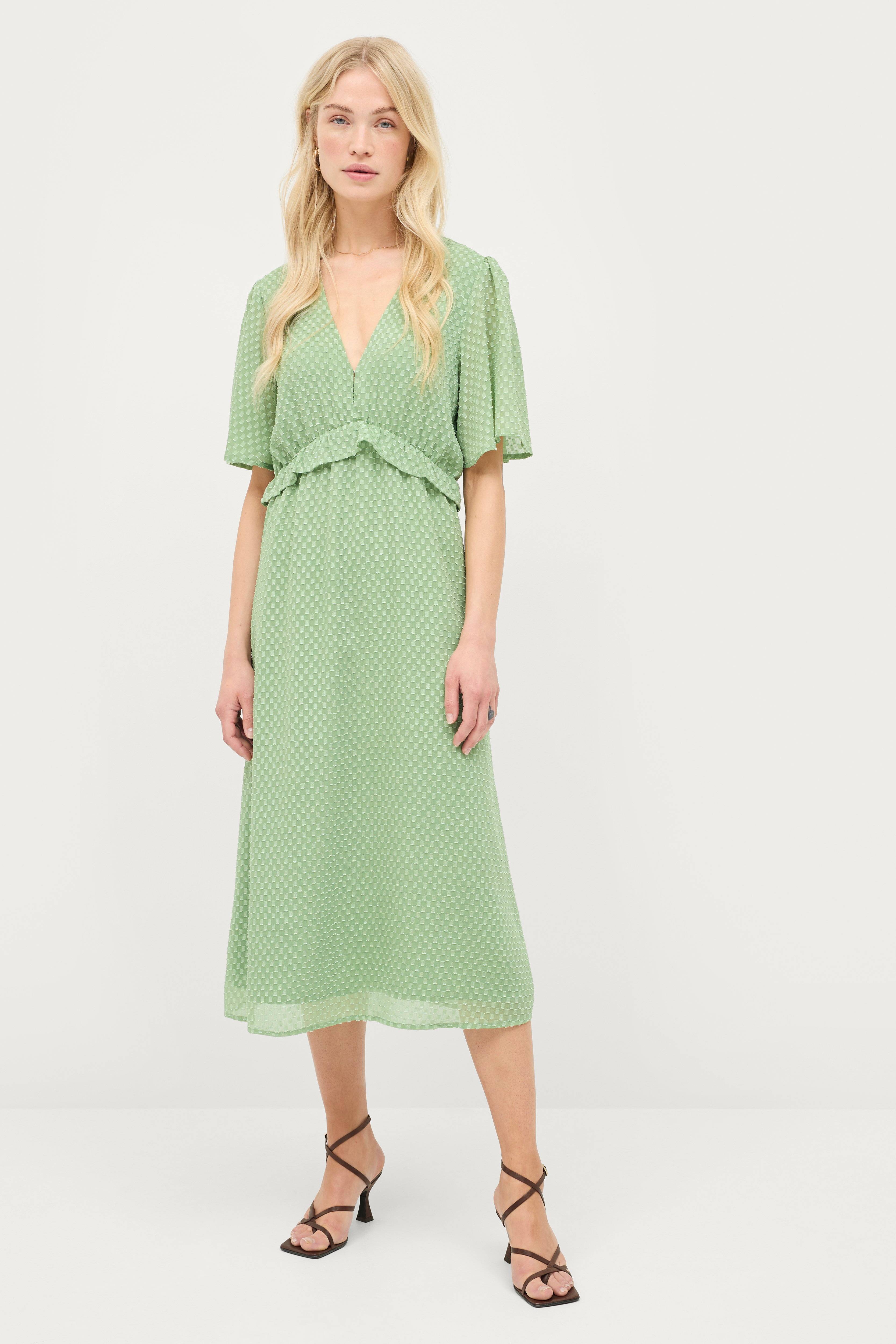 • V-udskæring• Korte sommerfugleærmer• Elastisk talje med volant• Fremstillet af chiffon med strukturmønster• Tyndt for• Længde: 120 cm i størrelse S