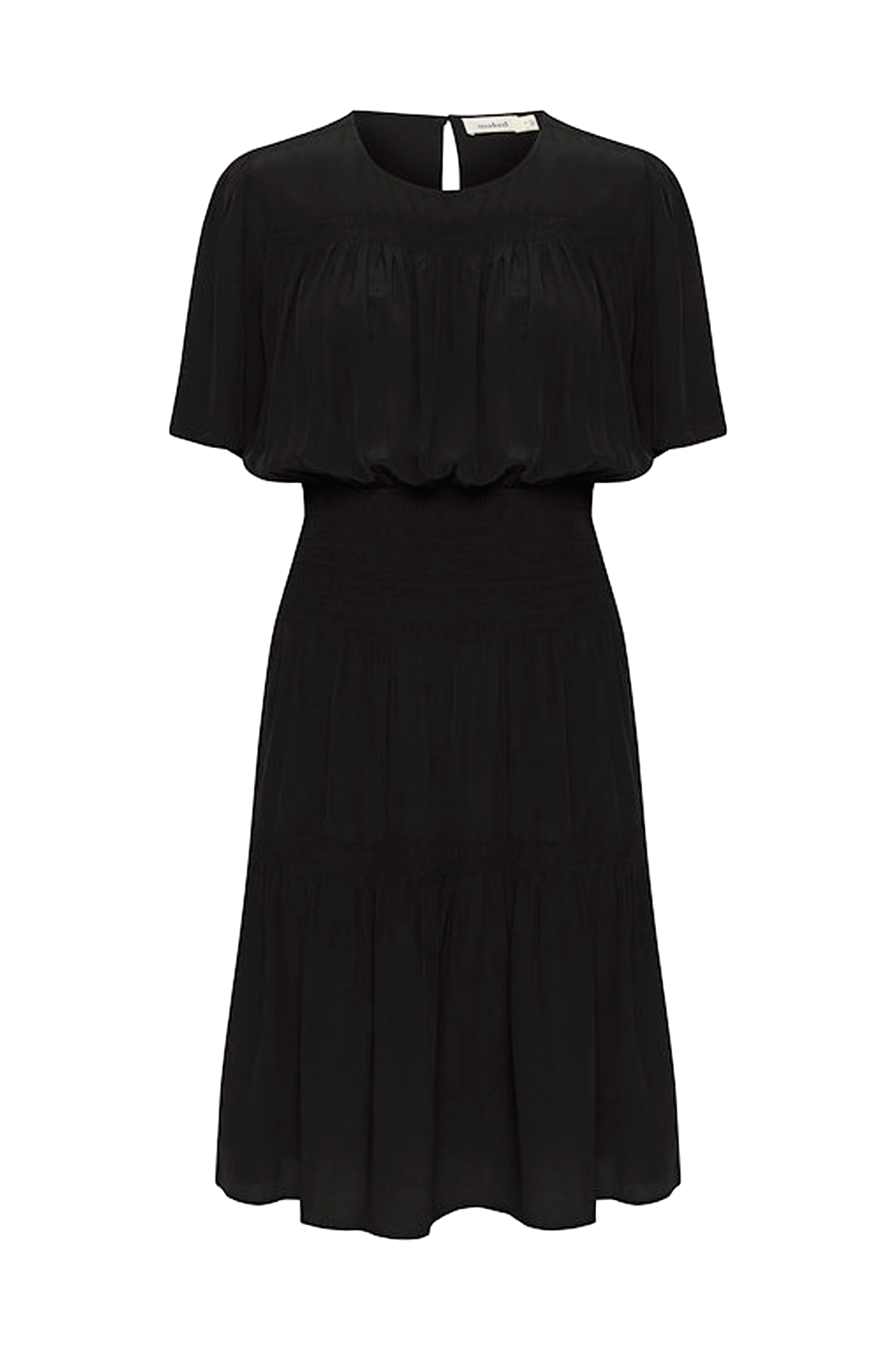 • Figurformede model i satin• Rund hals med knap i nakken• Elastiksømme på brystet og på skørtet• Kort, bredt ærme• Bred, elastisk smock ved taljen• Længde: 113 cm i størrelse S