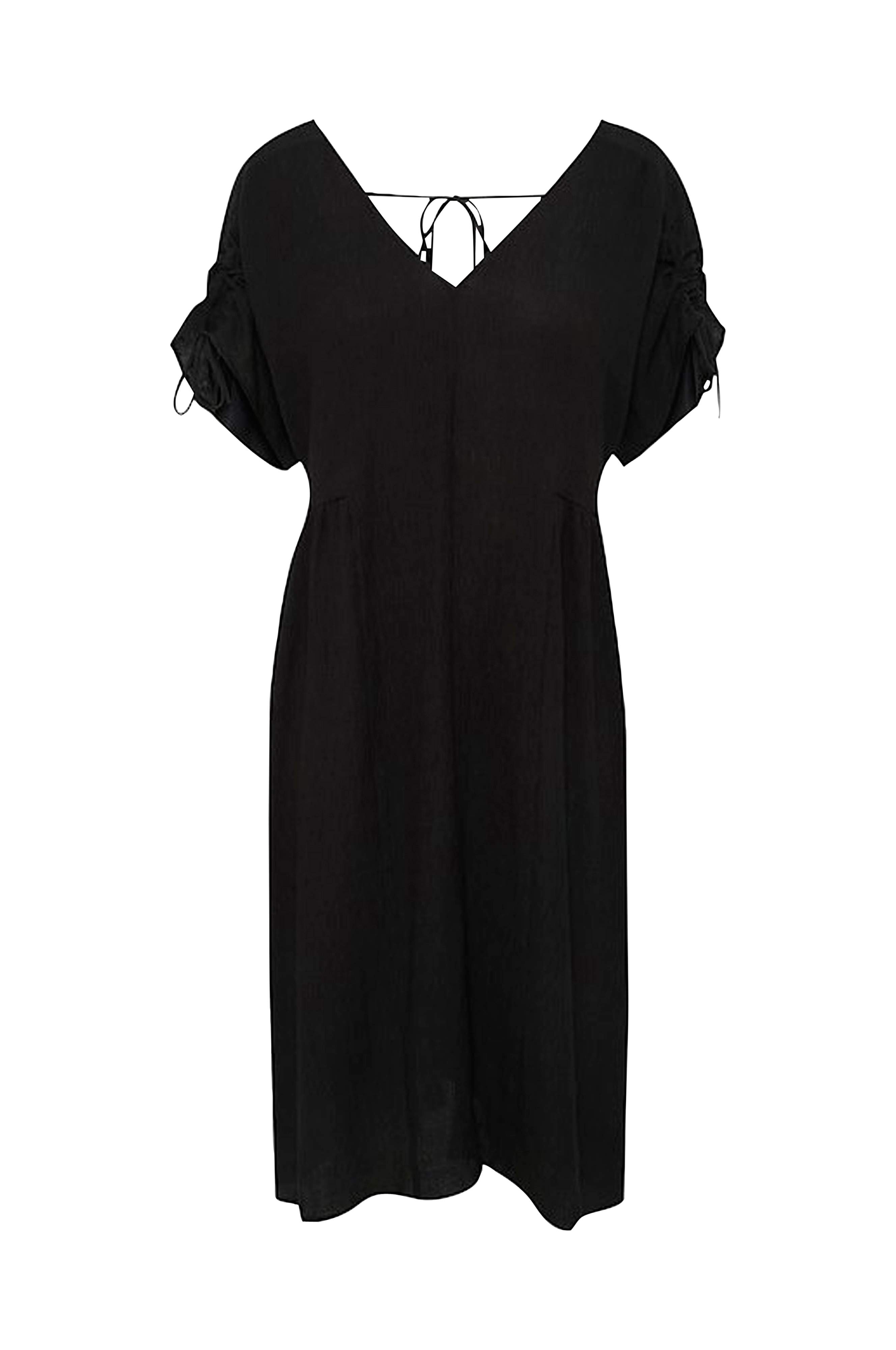 • Kjole i rynket viskose• V-udskæring foran og bagpå• Åbning med bindebånd i ryggen• Korte ærmer med justérbar træksnørre• Længde: 106 cm i størrelse S