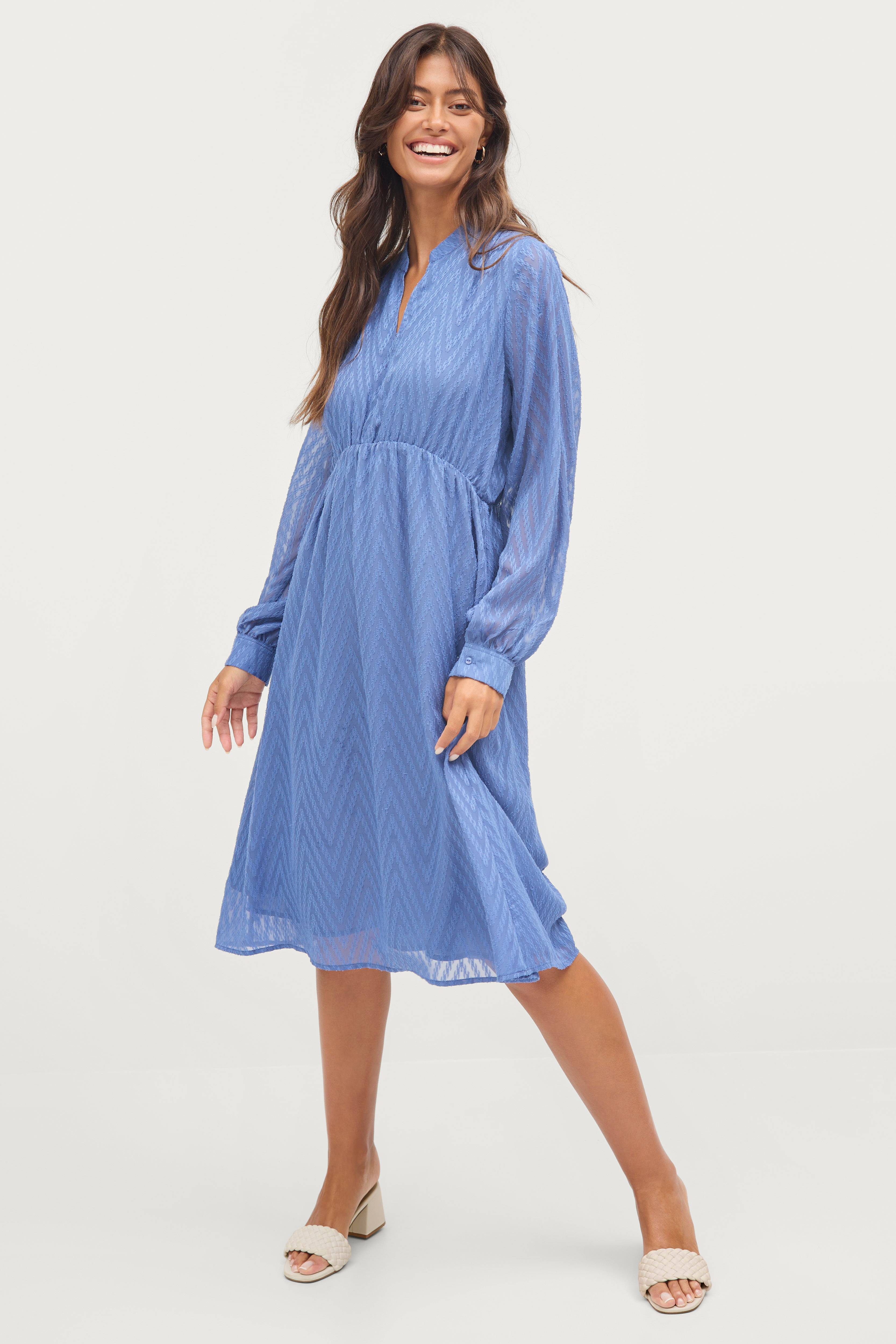 • Midikjole• V-udskæring• Elastisk talje• Ballonærmer med manchet• Fremstillet af chiffon med strukturmønster• Tyndt for• Længde: 110 cm i størrelse S