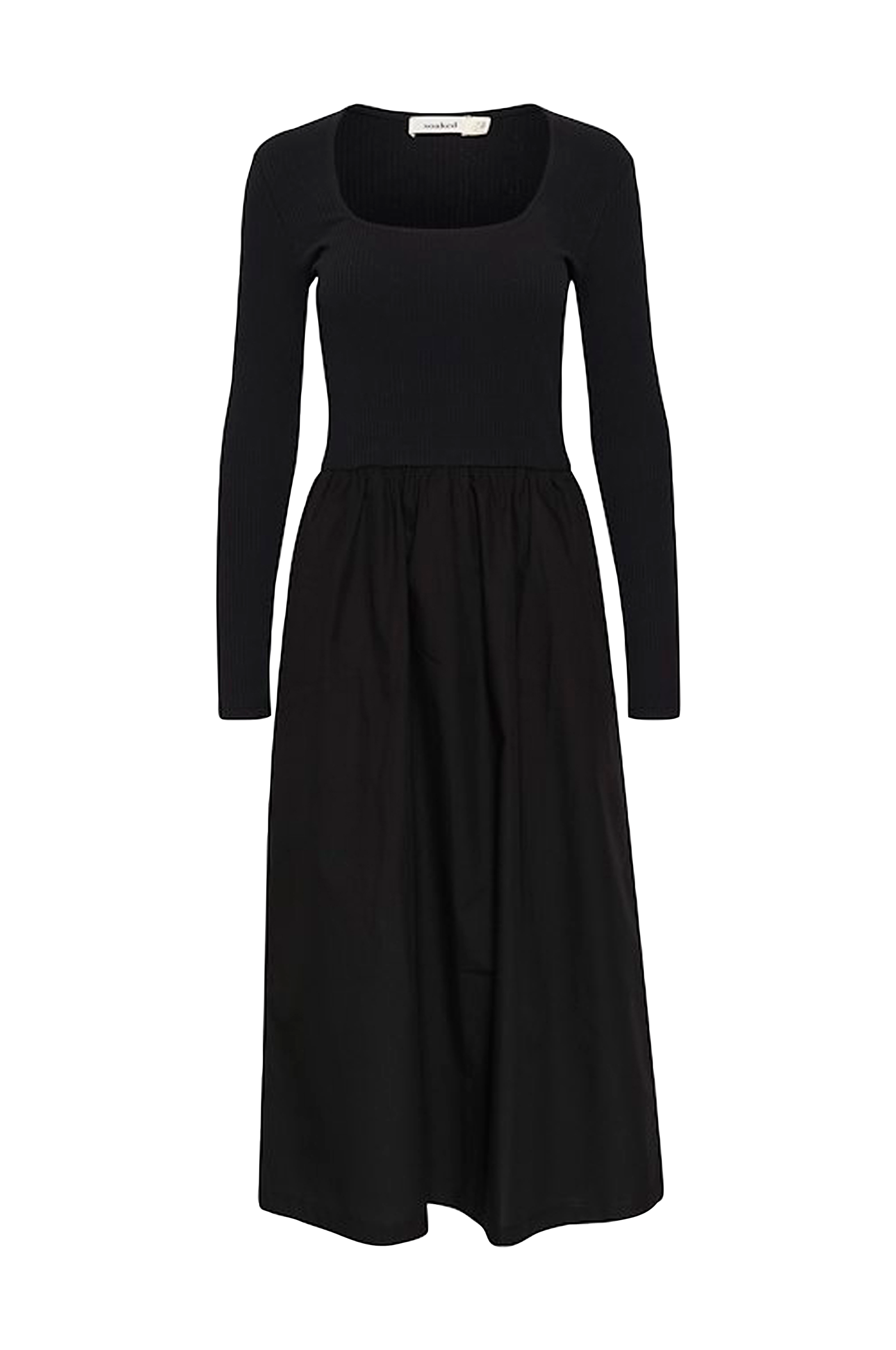 • Figurformede model med ribstrikket øvre del i jersey• Ekstra langt ærme• Defineret talje• Lang, bred nederdel i bomuldsvæv• Længde: 126 cm i størrelse S