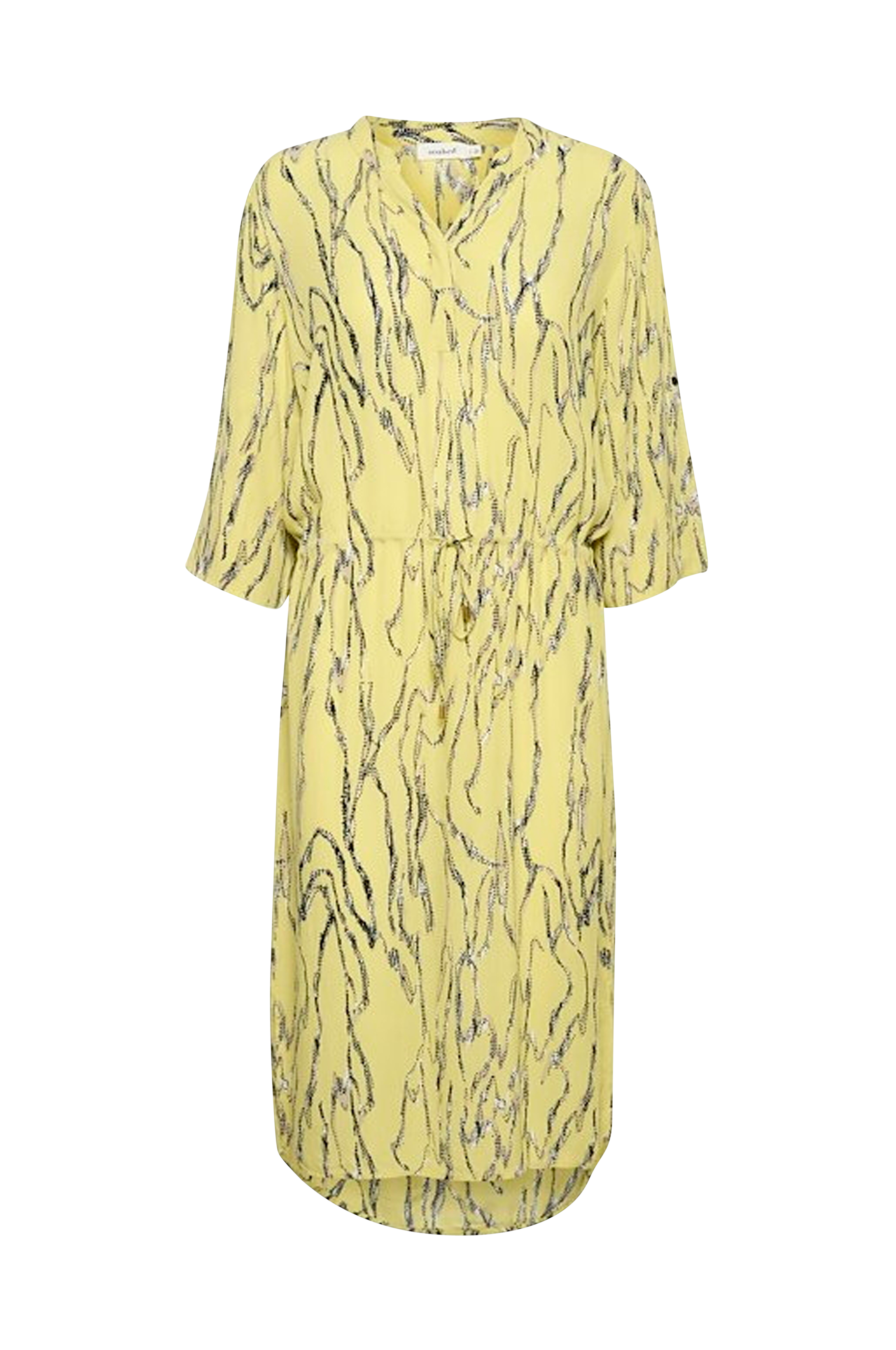 Kjole Zaya Dress fra Soaked in Luxury. A-formet model i afslappet snit med løbegang og bindebånd i taljen. Rund hals med kravekant samt V-udskæring foran og kort stolpelukning med skjulte knapper. Vidt, 3/4-langt ærme med indvendig knaptamp til opsmøgede ærmer. Vævet crepekvalitet med blødt fald. Længde foran ca. 115 cm og bagpå ca. 129 cm i str. M.