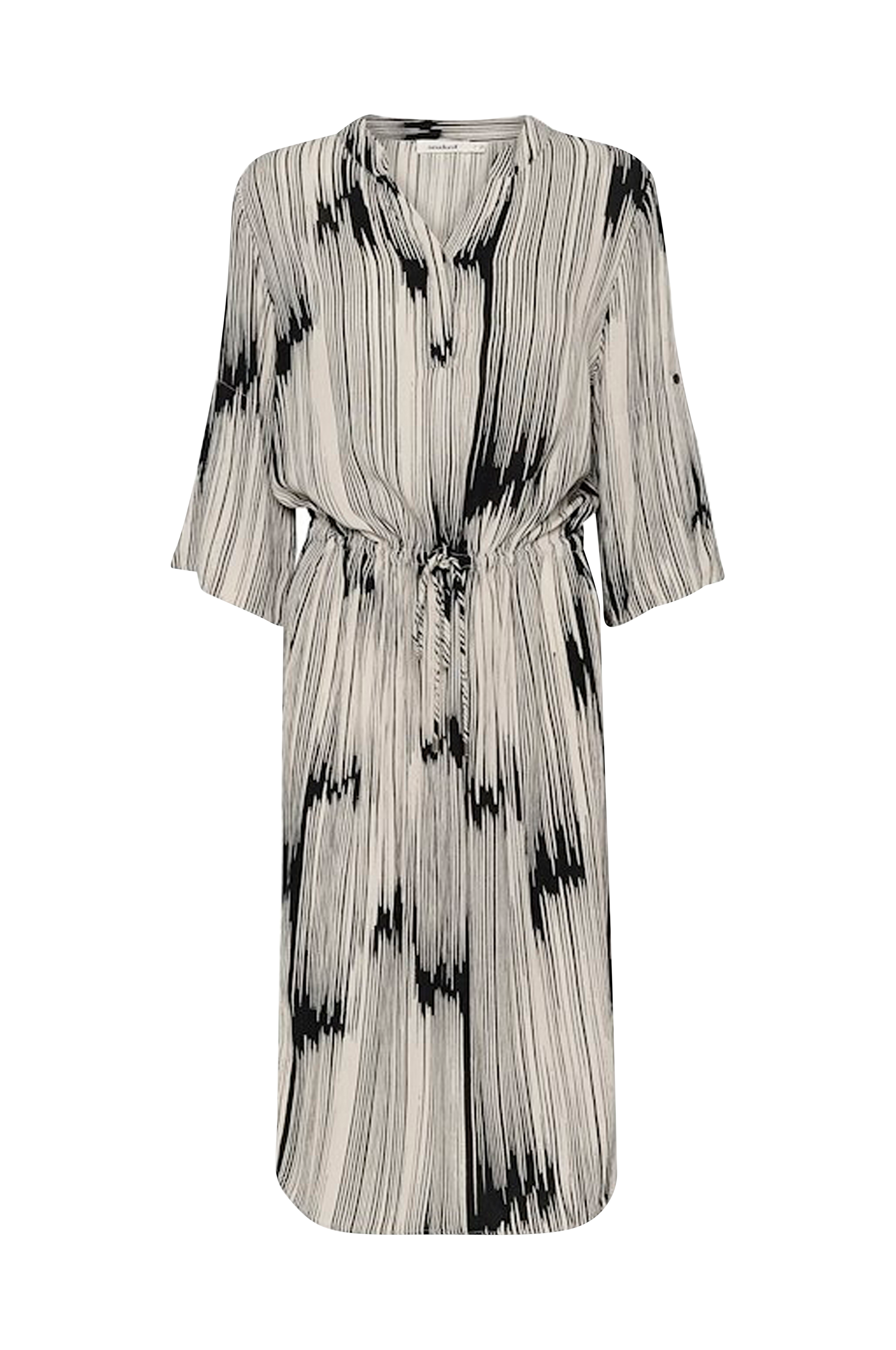 Kjole Zaya Dress fra Soaked in Luxury. A-formet model i afslappet snit med løbegang og bindebånd i taljen. Rund hals med kravekant samt V-udskæring foran og kort stolpelukning med skjulte knapper. Vidt, 3/4-langt ærme med indvendig knaptamp til opsmøgede ærmer. Vævet crepekvalitet med blødt fald. Længde foran ca. 115 cm og bagpå ca. 129 cm i str. M.
