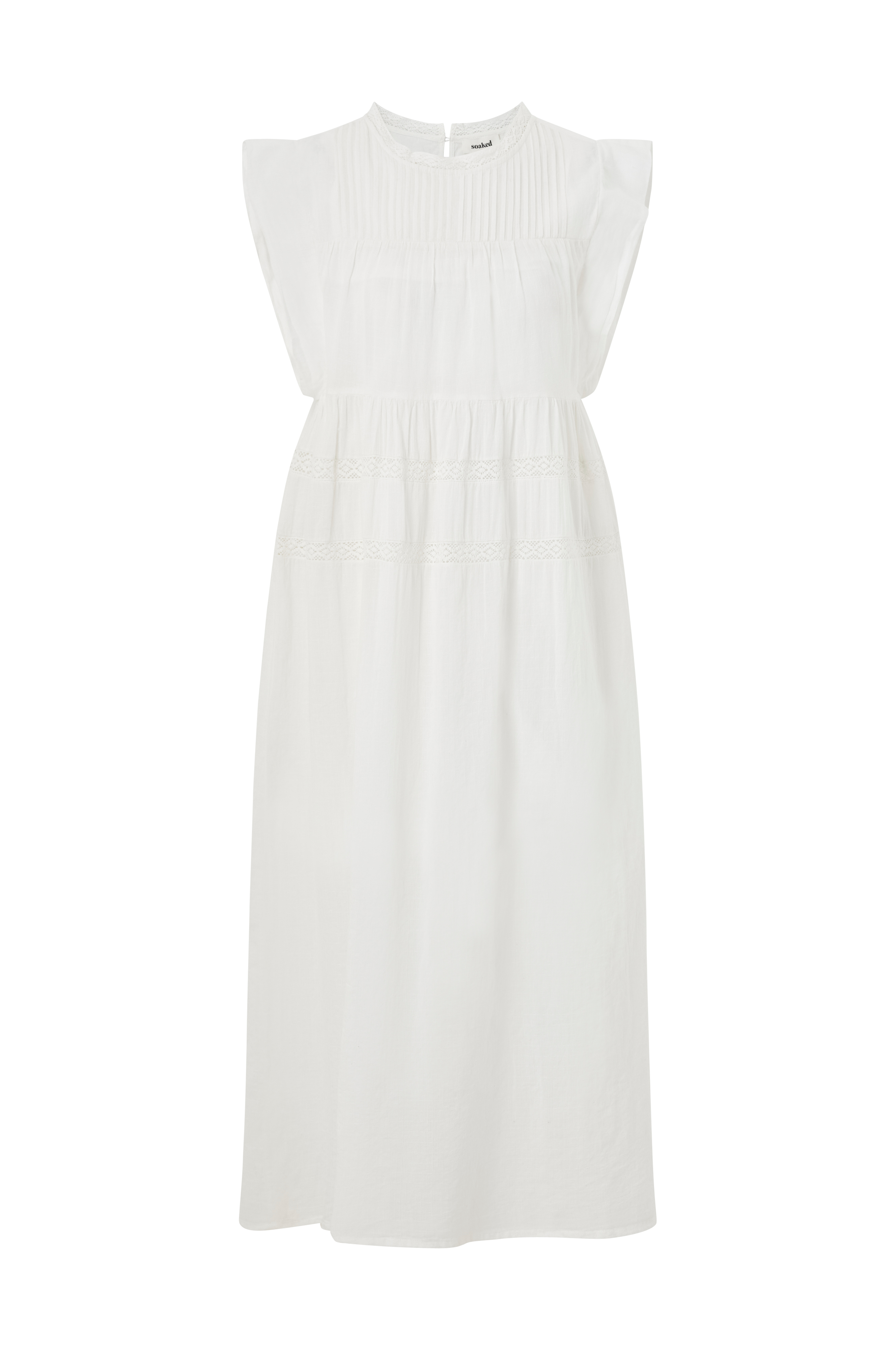 • Løs pasform• Rund halsudskæring med blondekant• Nøglehulsåbning bagpå med knap i nakken• Biselæg oppe foran• Blondeindlæg øverst på nederdelen• Korte flagrende ærmer• Længde: 132 cm i størrelse S