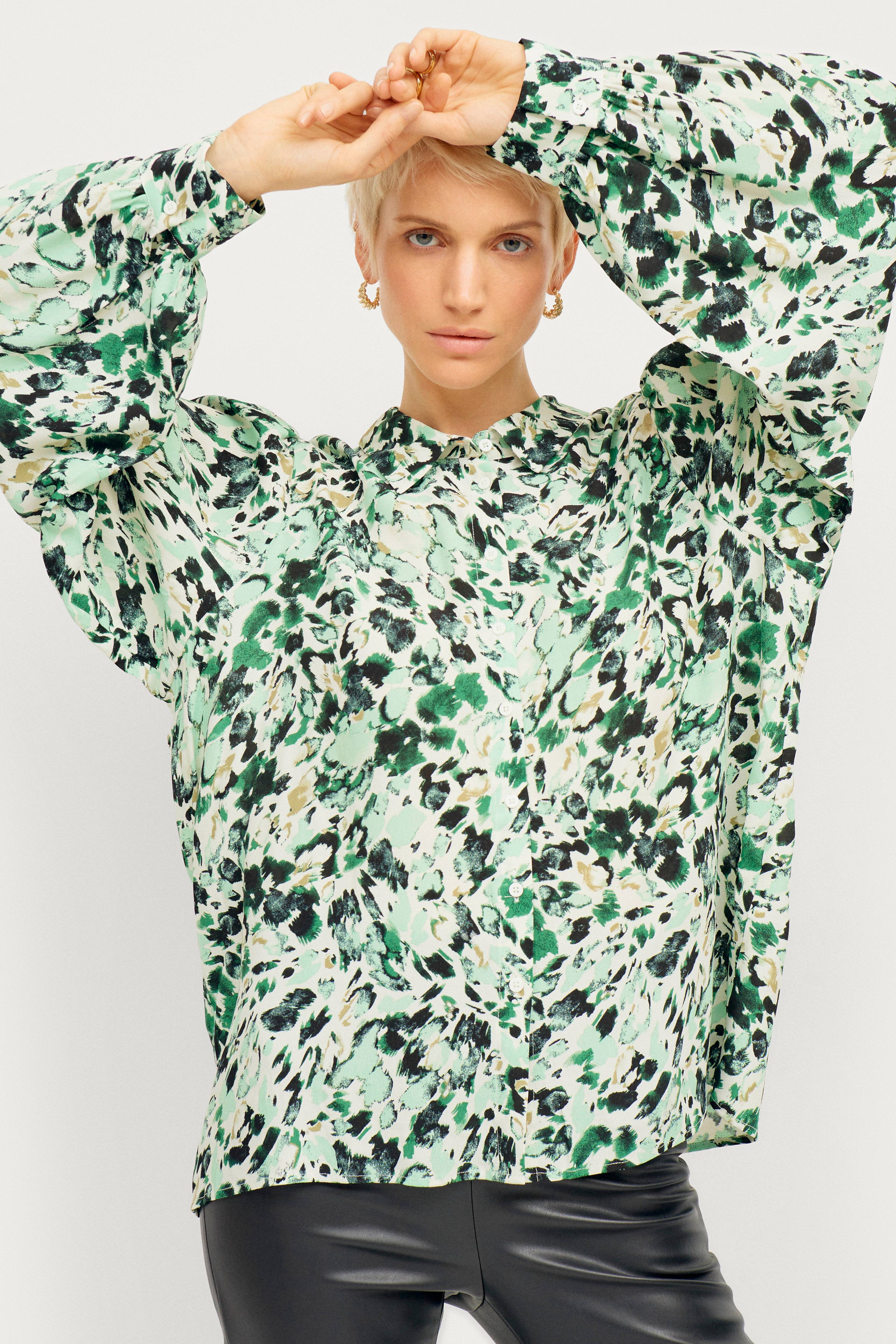 Skjorte i blød viskose med printet mønster. Vide ballonærmer med en knap i ærmekant.