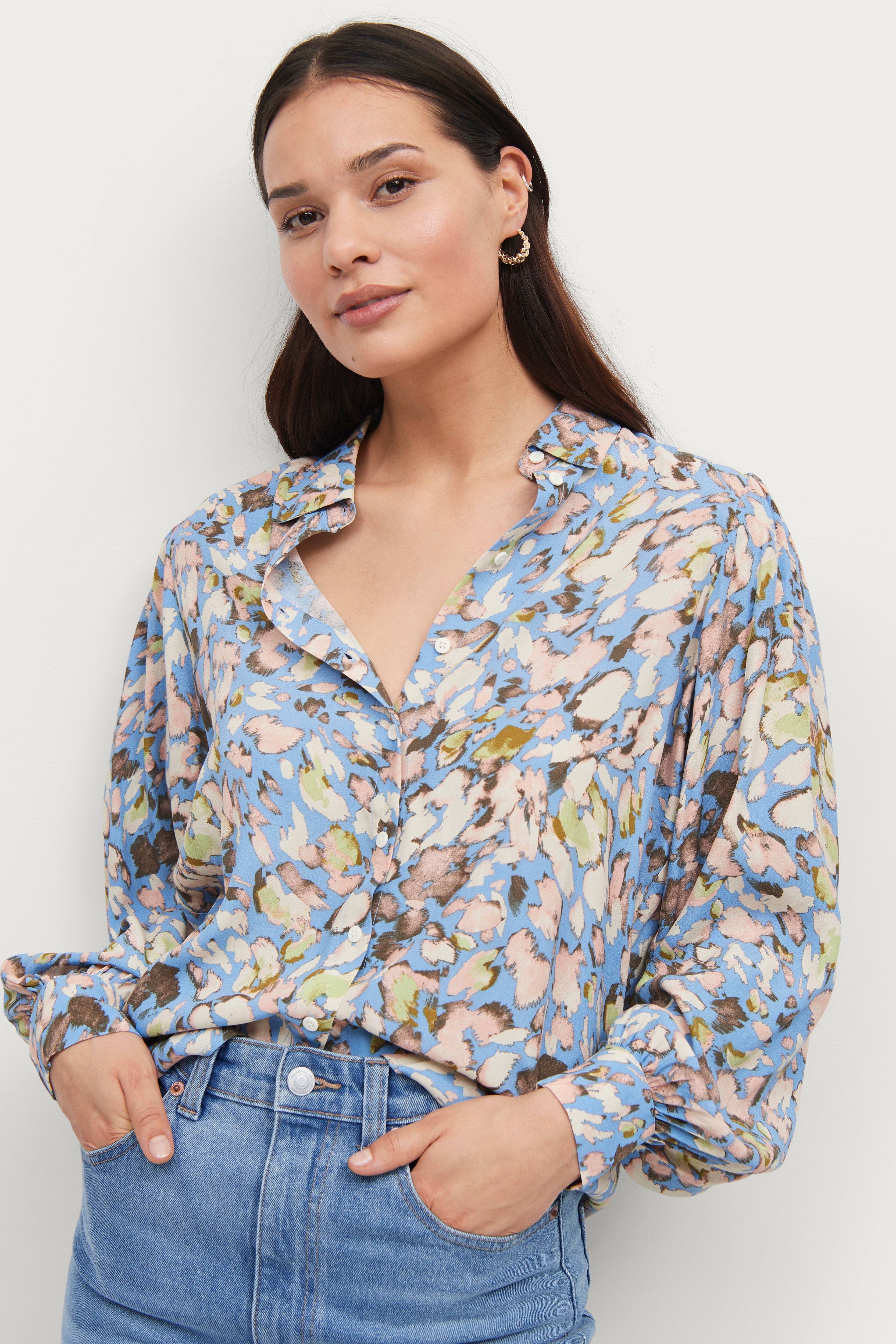 Skjorte i blød viskose med printet mønster. Vide ballonærmer med en knap i ærmekant.