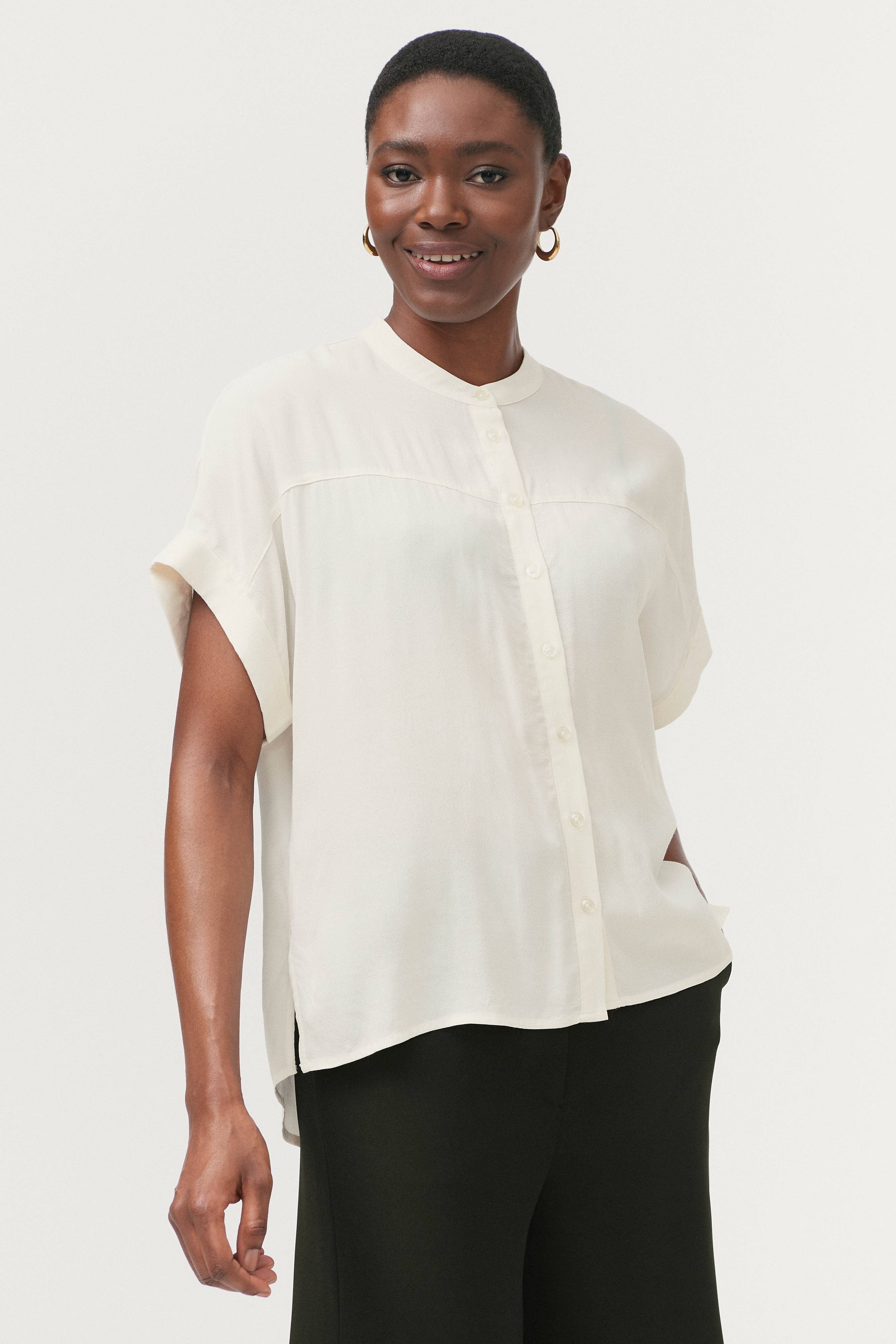Lige oversizemodel med lav skulder og kort ærme med fast opslag i ærmekanten. Rund hals med påsyet kant og stolpelukning hele vejen foran samt afskåret skulderbærestykke foran. Slids forneden i siderne og afrundet kant forneden bagpå som er lidt længere.