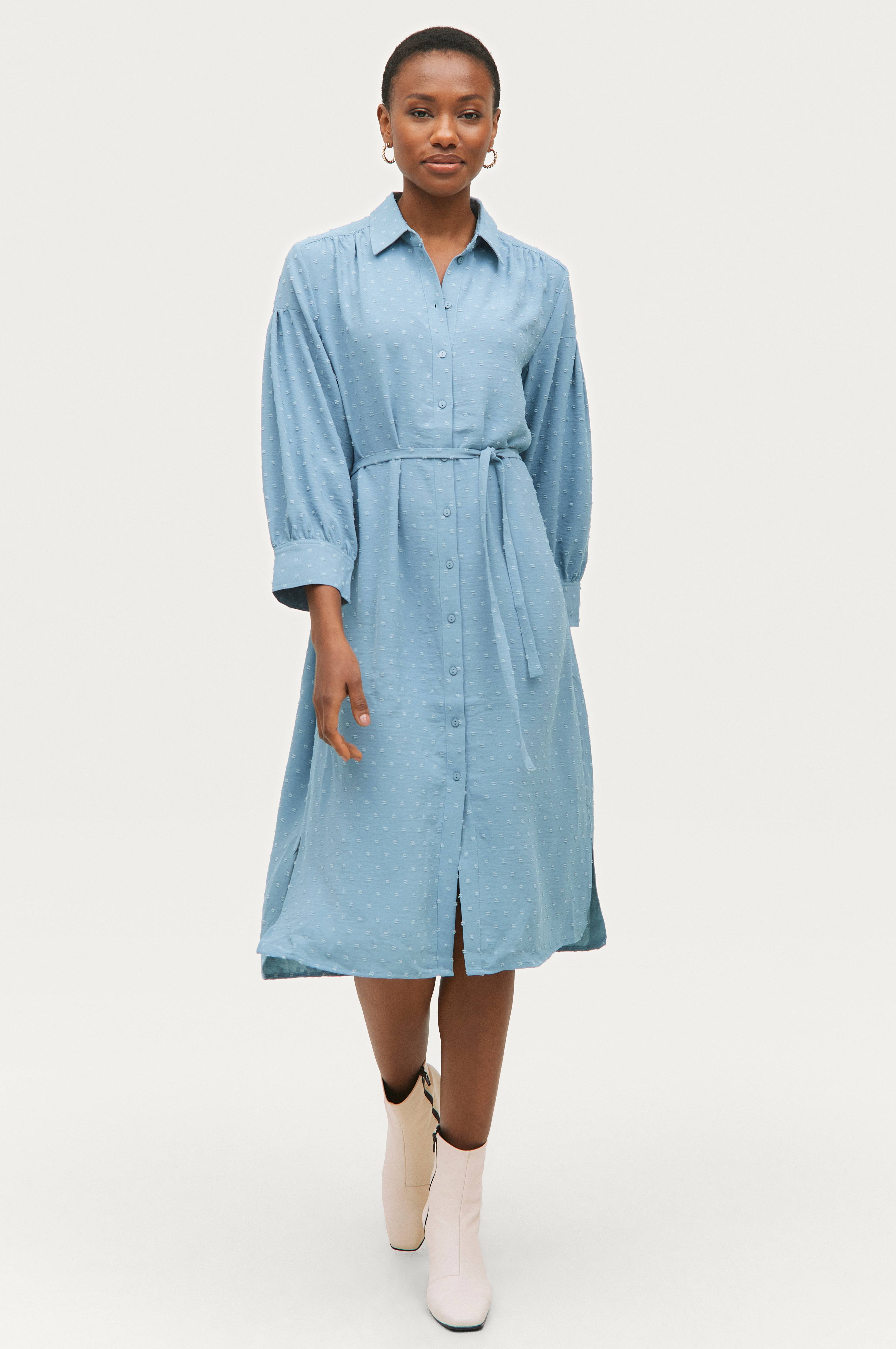 • Knapper foran• Bæltespænde ved taljen• Lange ballonærmer med rynket søm på toppen• Rynket linning• Korte slidser nede i siderne• Mønstervævet kvalitet• Længde: 115 cm i størrelse S